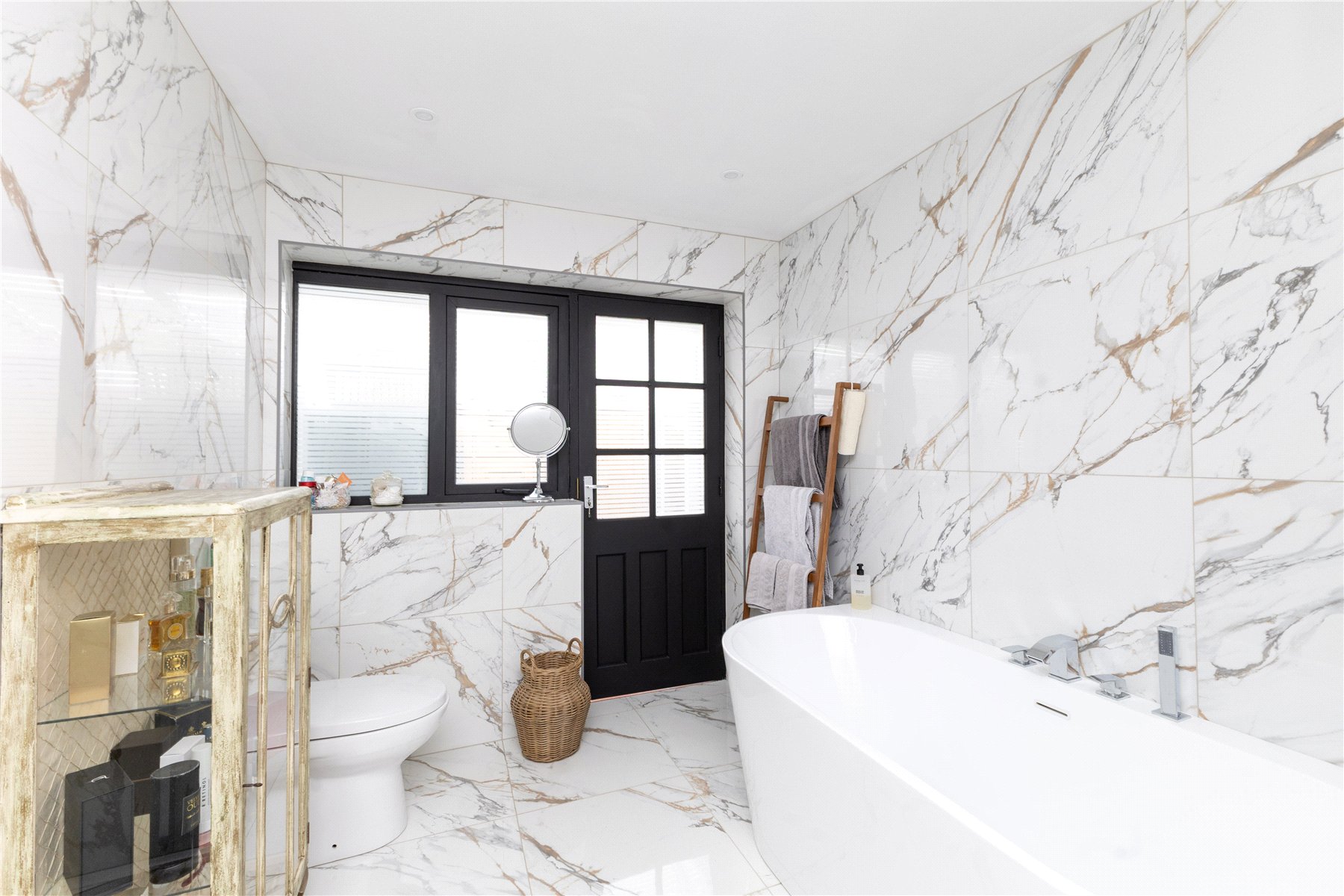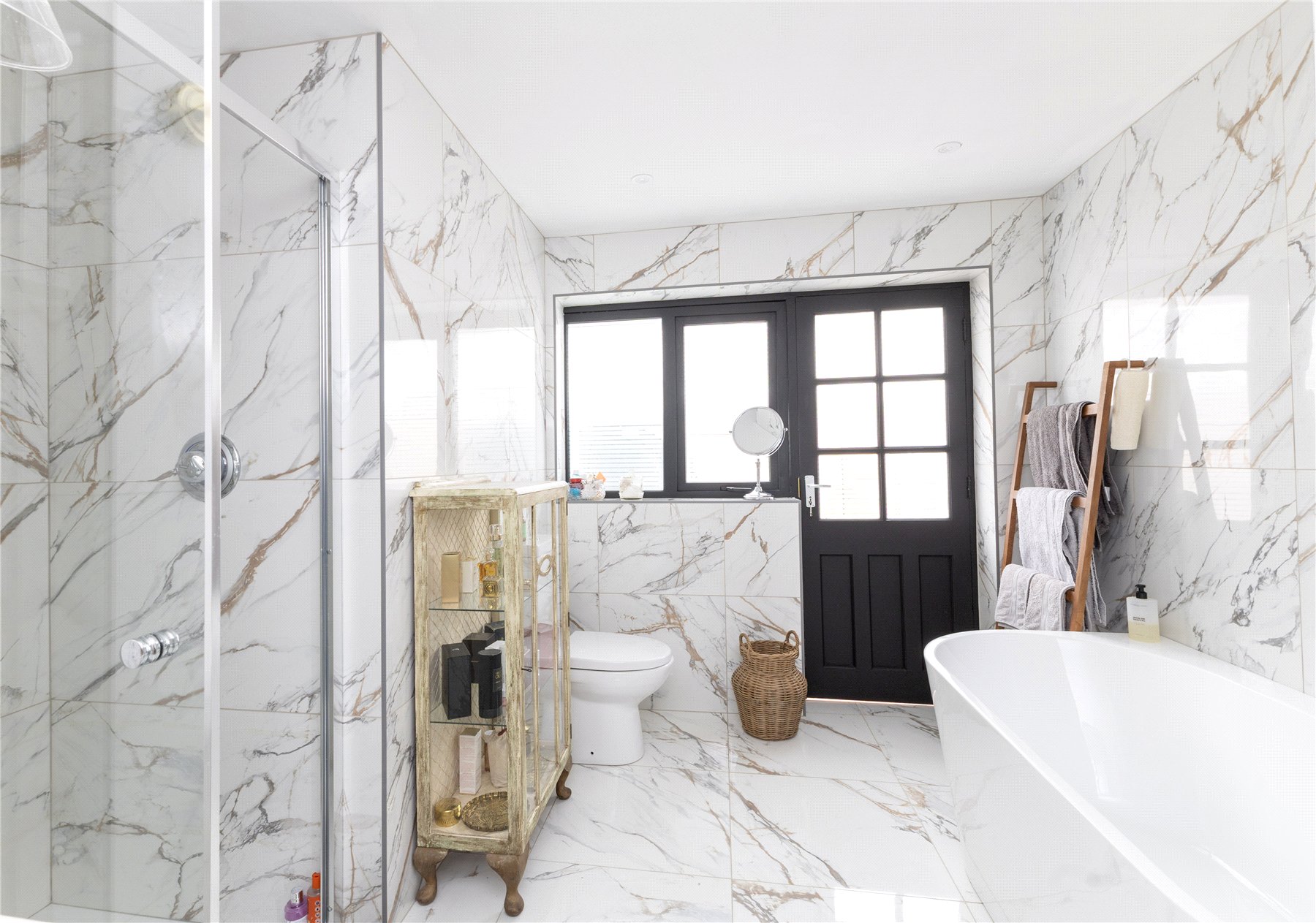 Modern fully tiled bathroom with both free standing bath and separate shower, plus a door leading through to a conservatory laundry area