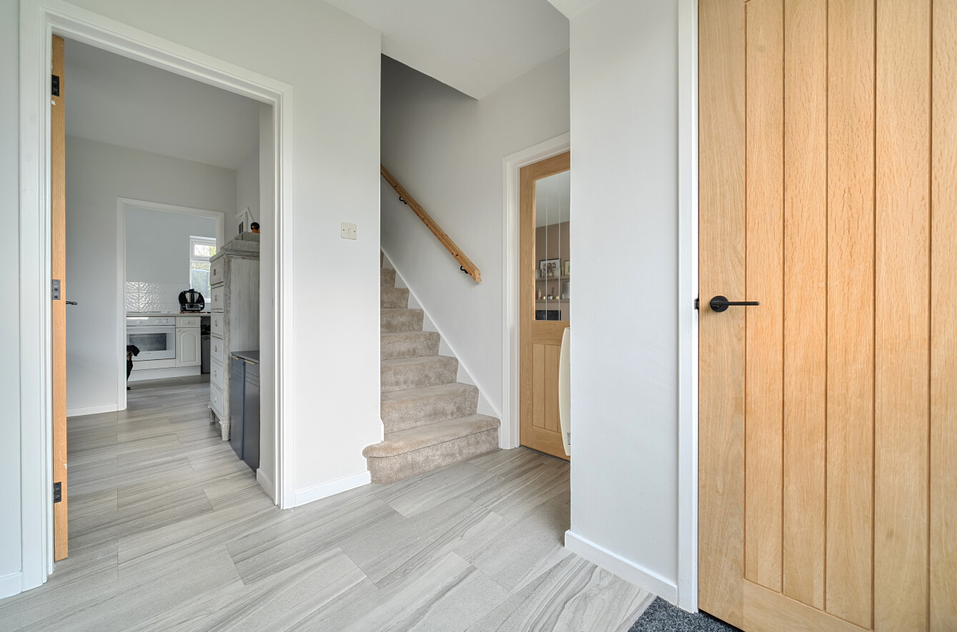 To the front of the house is a lawned front garden with an adjacent driveway, recently laid with attractive block, offering parking for three vehicles in addition to the detached garage.