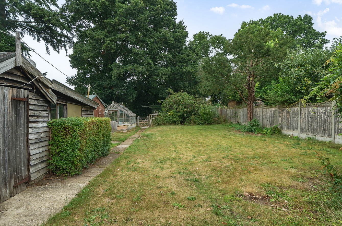 Large rear garden, predominantly laid to lawn, with a shed, workshop (light and power installed), wood store and a greenhouse