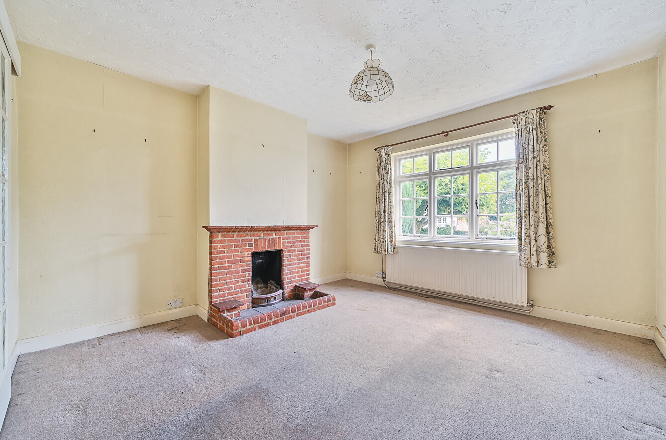 A front aspect living room with feature brick fireplace and open fire