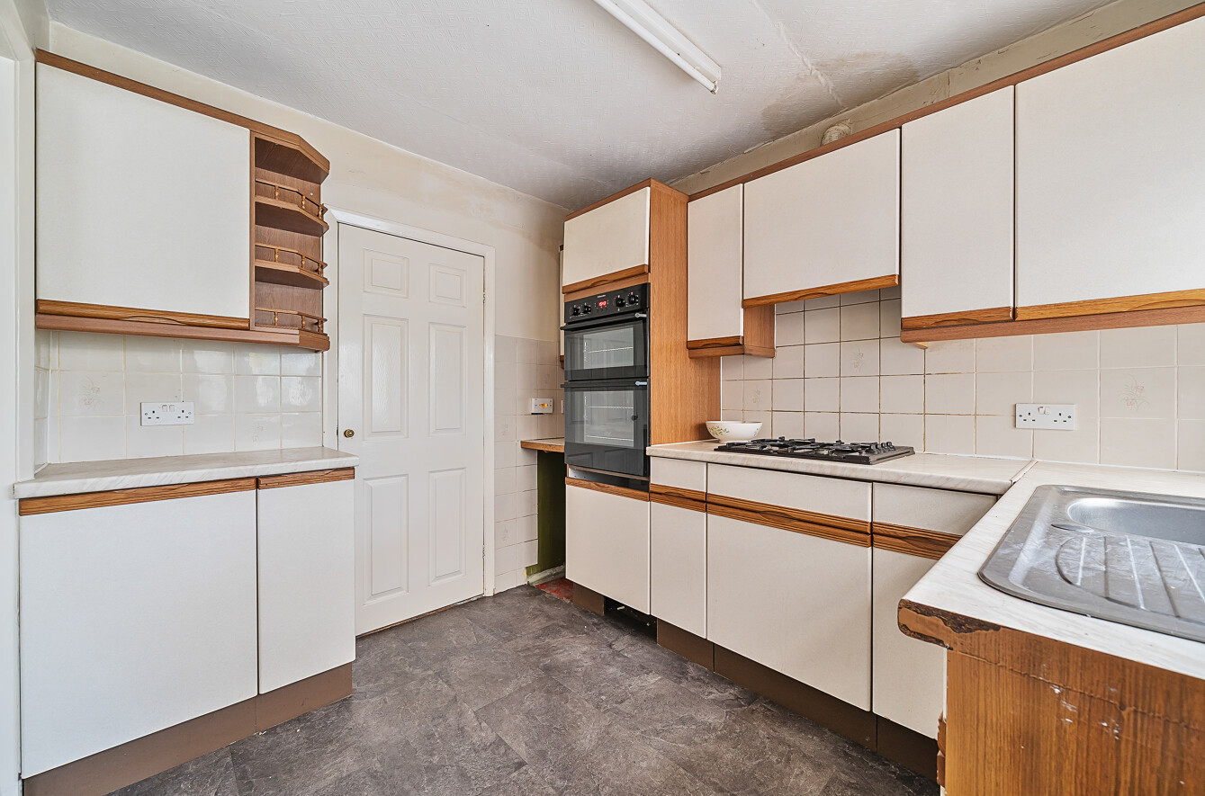 Kitchen with range of low and high level storage units, double oven and gas hob