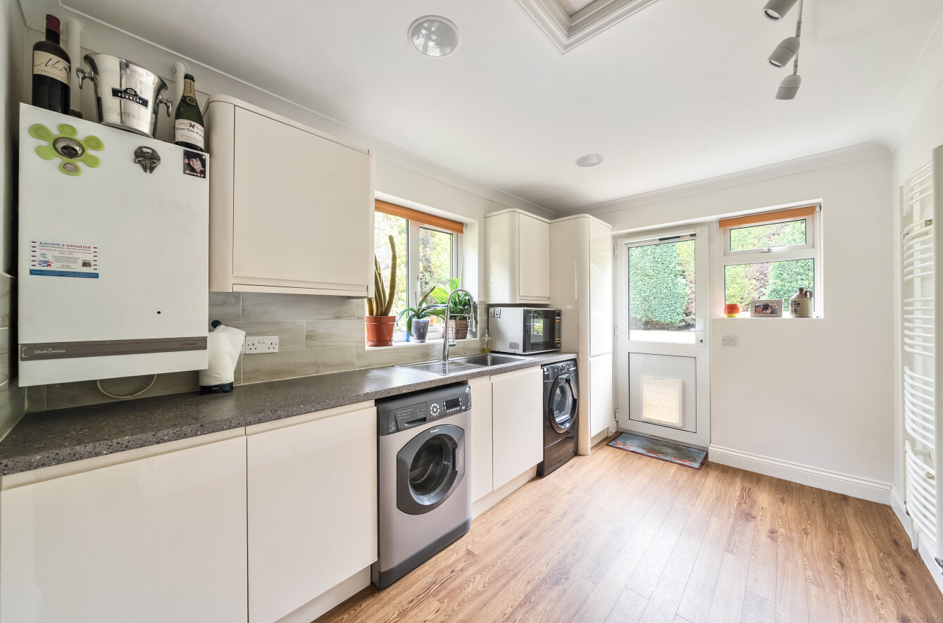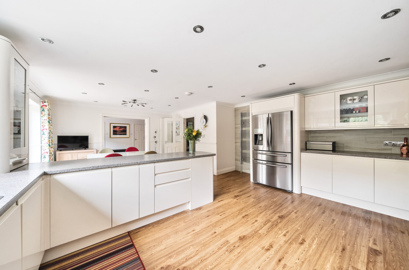 To the front of the main house is a large formal sitting room with a central fireplace currently housing a remote control gas fire. To the rear is a modern open plan kitchen dining room, with patio doors from the dining area onto the rear garden. The kitchen is fitted with an excellent range of drawer and cupboard storage including an integrated dishwasher and double oven/grill plus gas hob with space for an American fridge freezer. Off the kitchen is a useful utility room with cloakroom and garden access.
