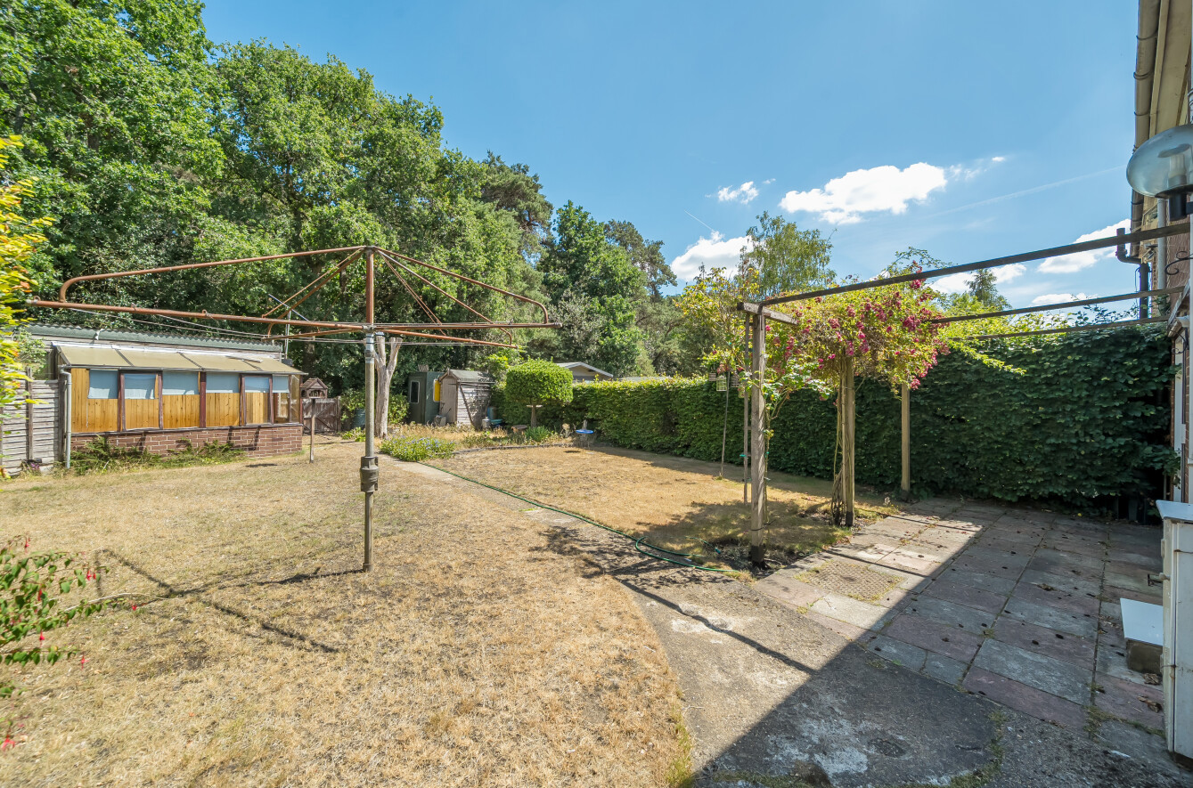 Large garden with a range of storage sheds and a gate leading straight onto Hogmoor Inclosure.