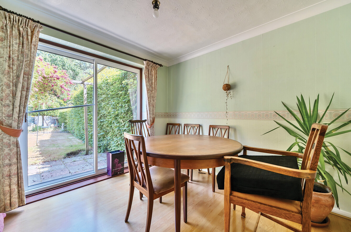 Through an archway is a bright dining room with patio doors onto the garden.