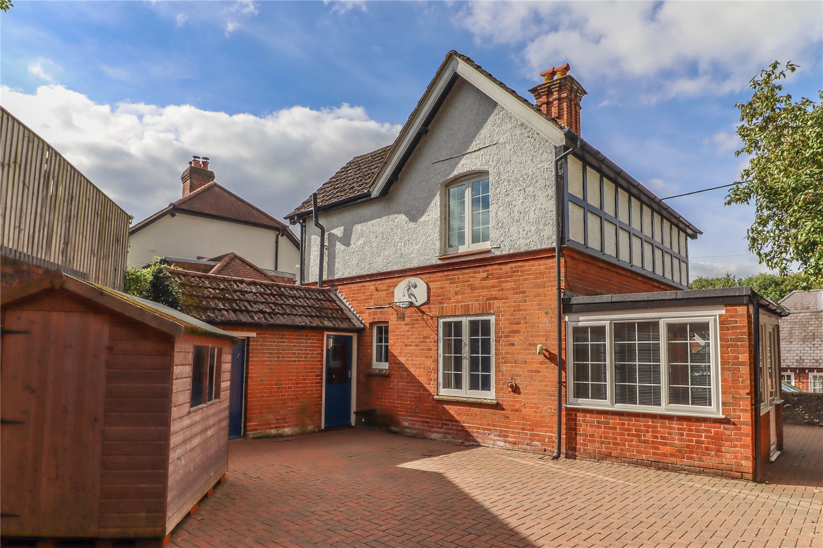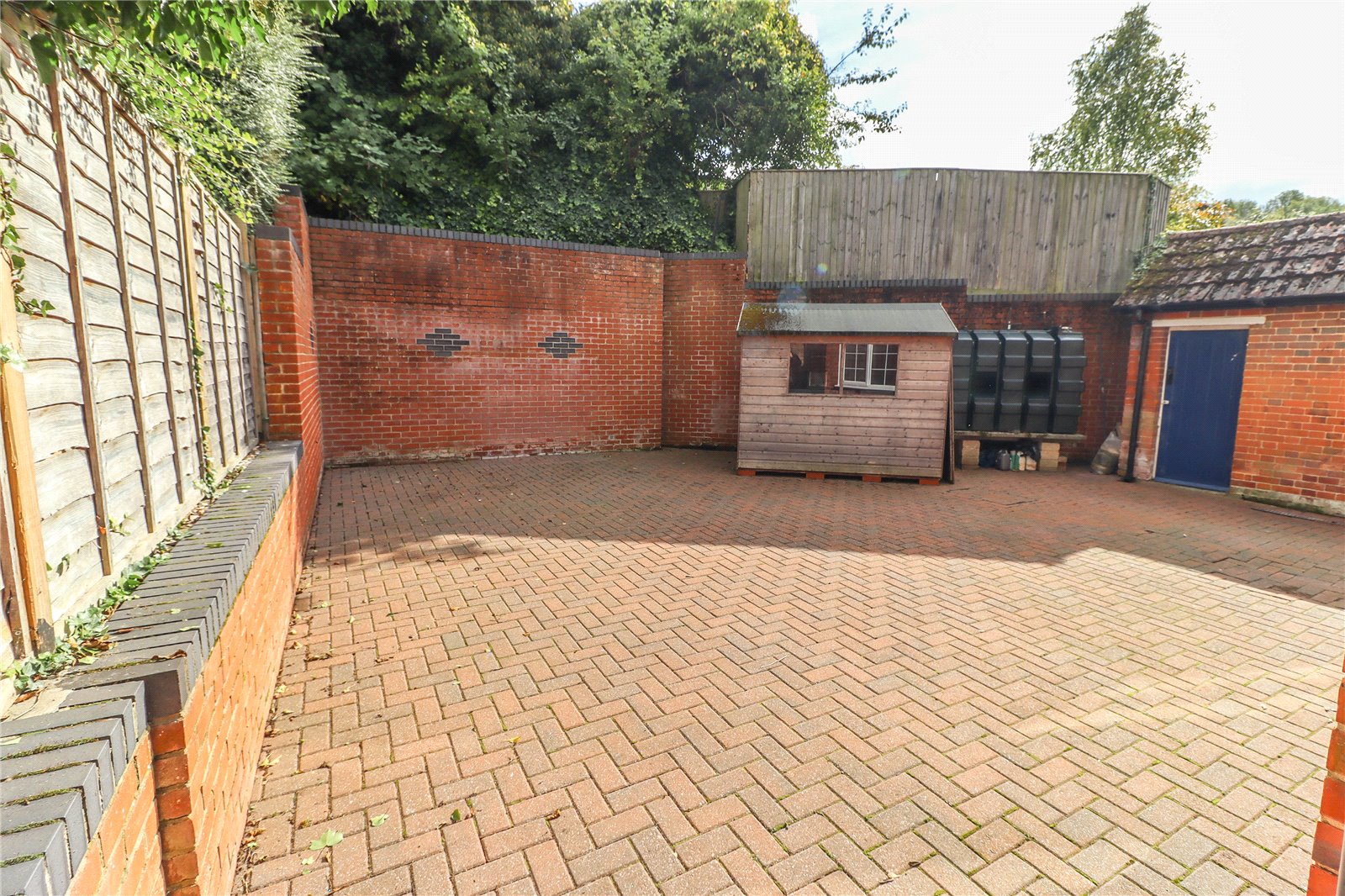 Main Garden A spacious wrap round area, level and herringbone block paved. Enclosed on all sides by walls. The rear boundary is enclosed by a tall brick retaining wall with diamond patterning. Chalk bank above with ivy, trees and climbing plants. Raised oil tank. Timber garden shed.