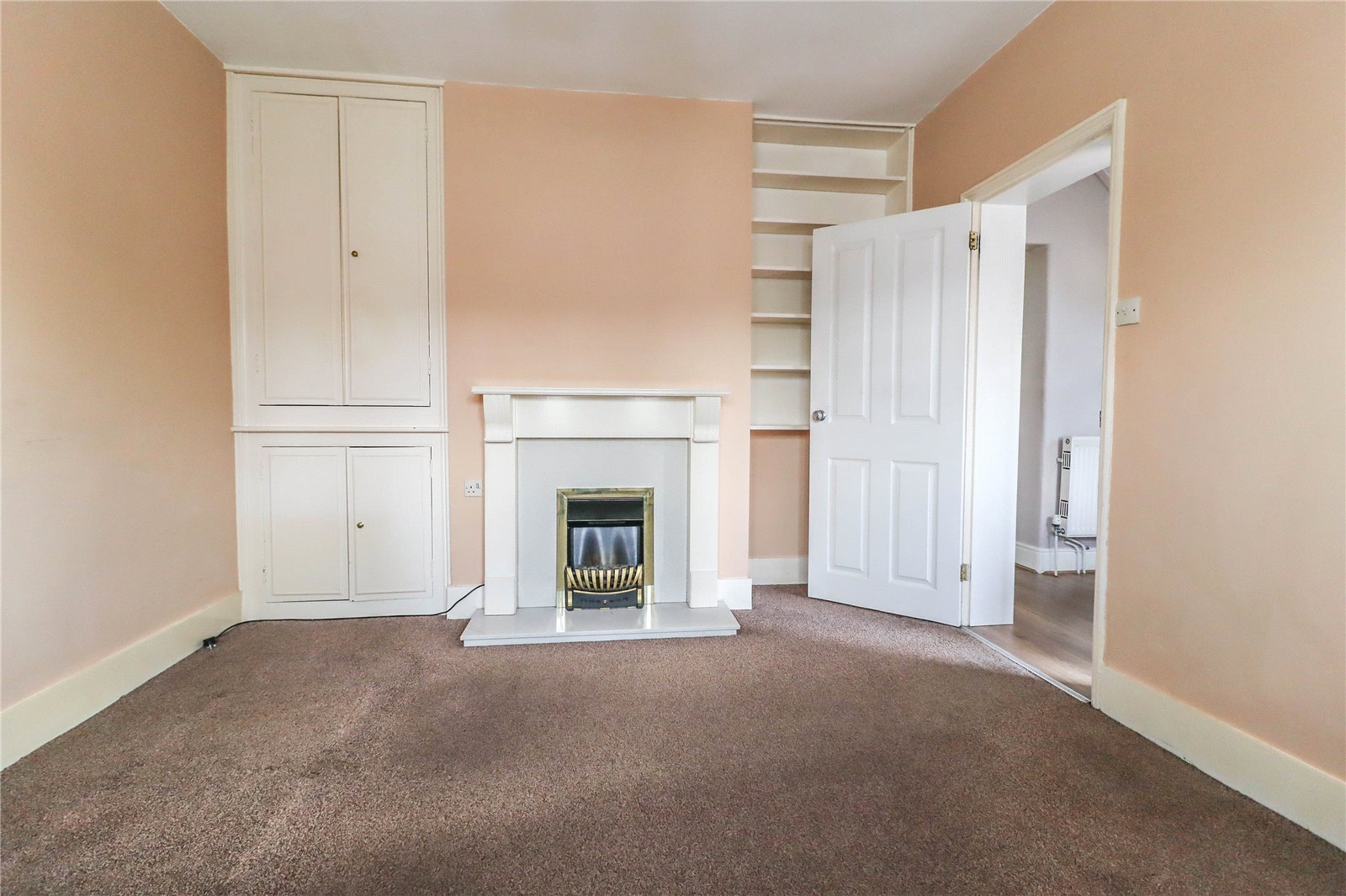 Sitting Room A cosy square reception room centring on an open fireplace with inset coal effect electric fire. Quartz surround and raised hearth. Timber mantelpiece. Recesses to either side of chimney breast. One with high level/display shelving. The other with built-in cupboards. Wide bay picture window to front aspect. Pendant light point.