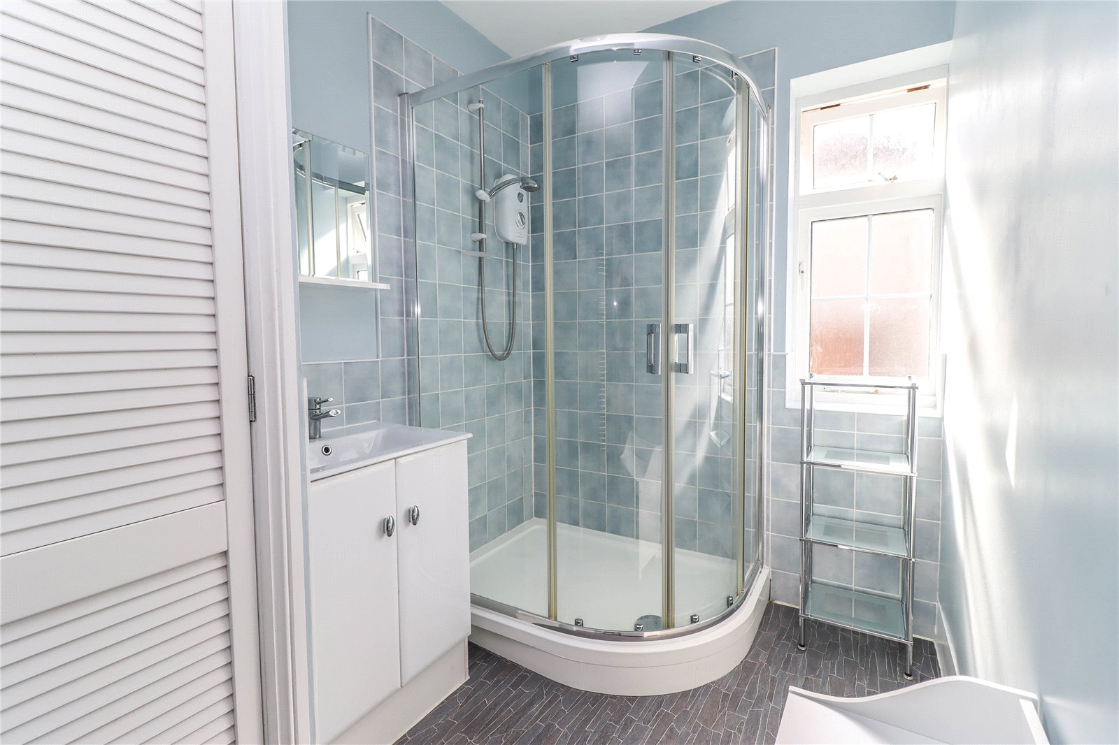 Shower Room White suite comprising wide ceramic wash hand basin with double cupboard beneath, mixer tap, tiled splashback and mirror above. Large curved glass/tiled enclosure with electric Mira shower. Tall chrome towel radiator. Obscured glazed window to side aspect. Ceiling light point. Double doors conceal a deep cupboard housing lagged copper cylinder with fitted immersion and slatted shelving above.