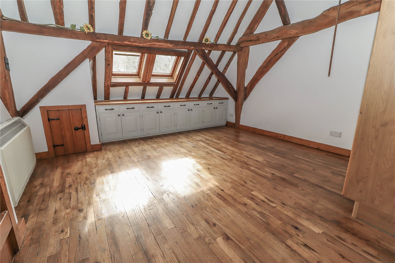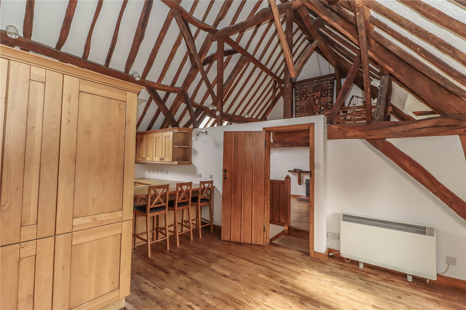 Dining Area Tall oak cupboards to one side. Long oak top dresser extends under eaves with a range of drawers and cupboards beneath. Oak strip flooring continues. Space for large dining table and dresser. Impressive exposed beams and framework under high vaulted ceiling. Eaves storage cupboard. Spotlights.