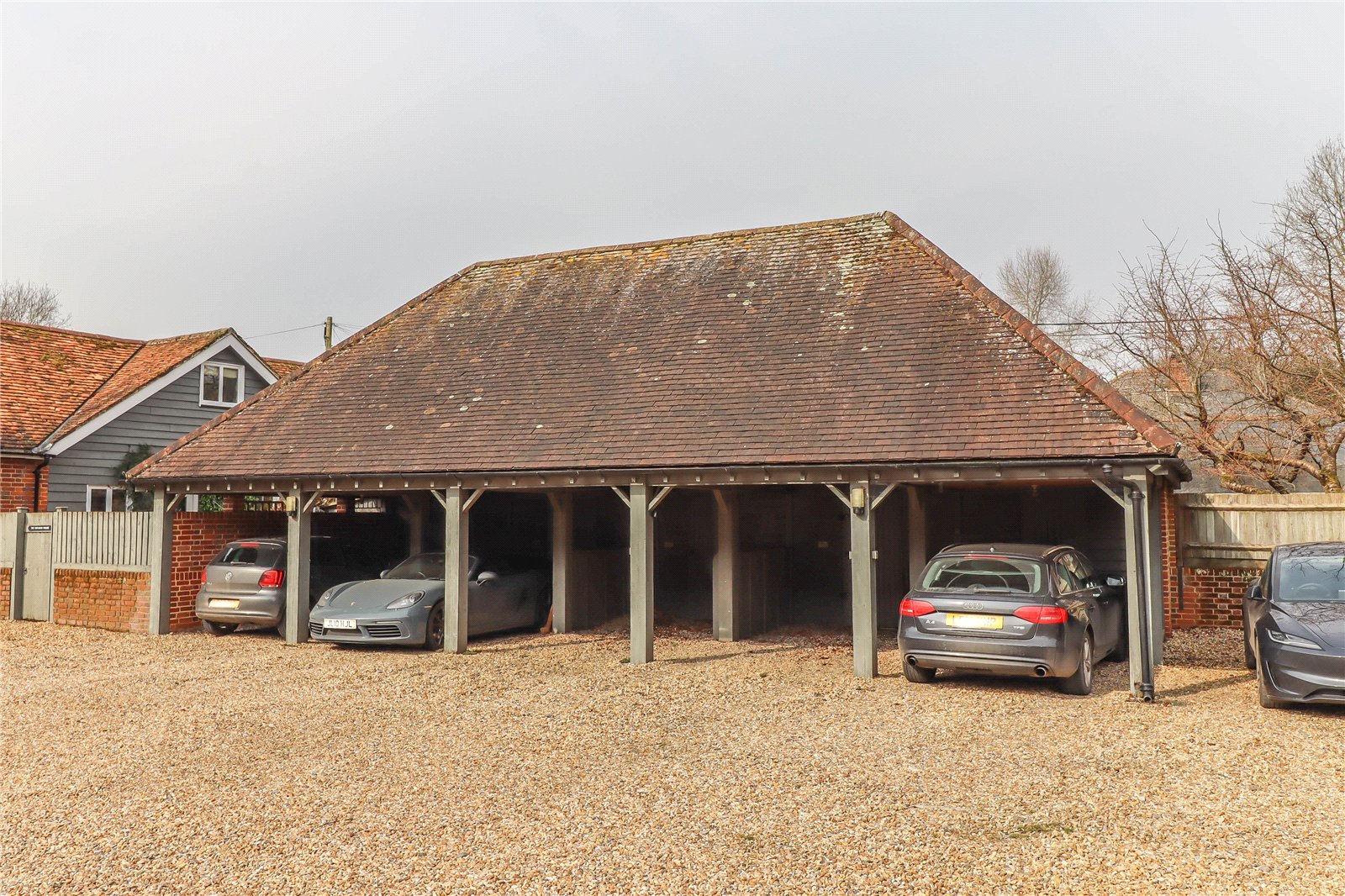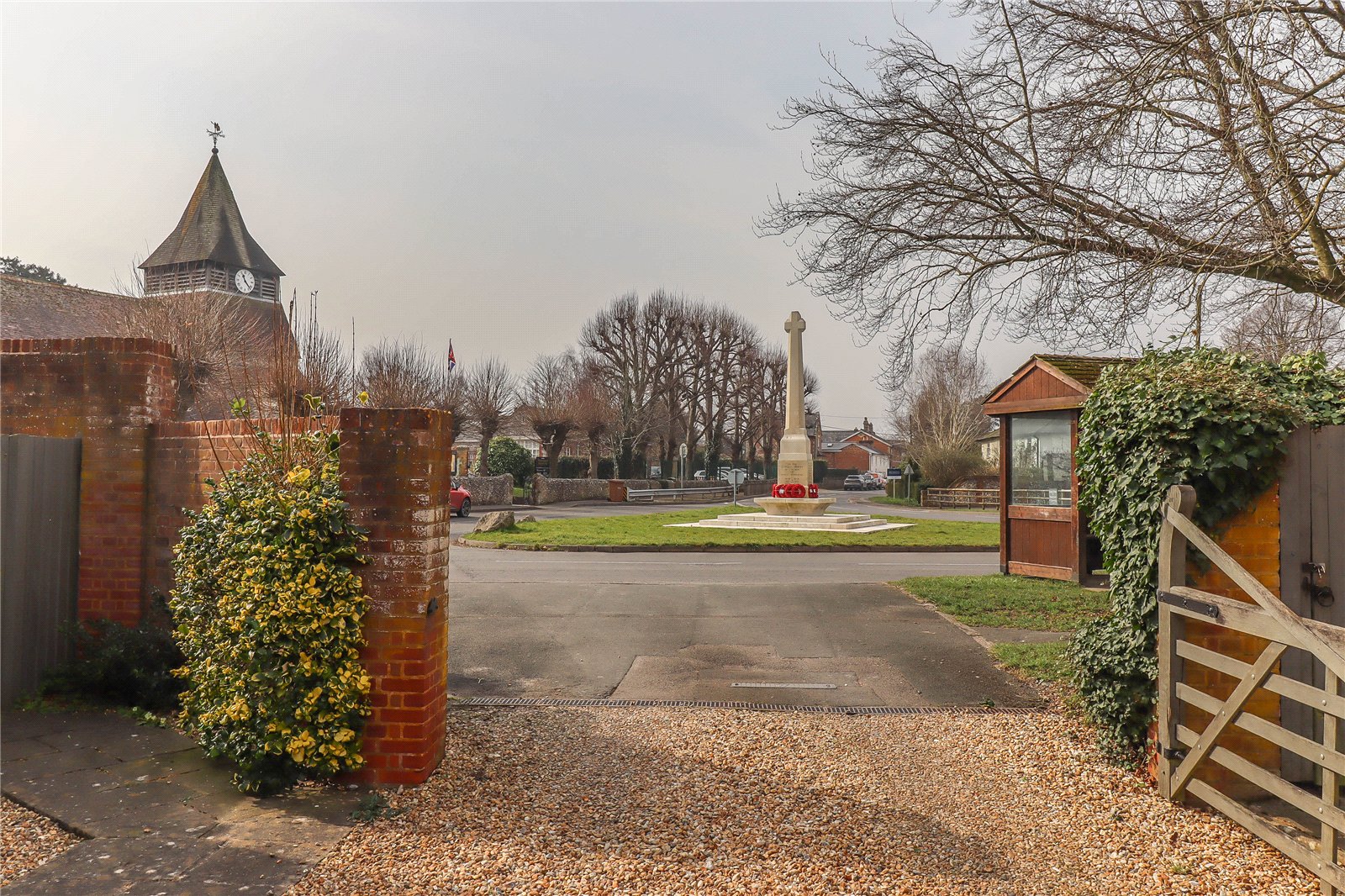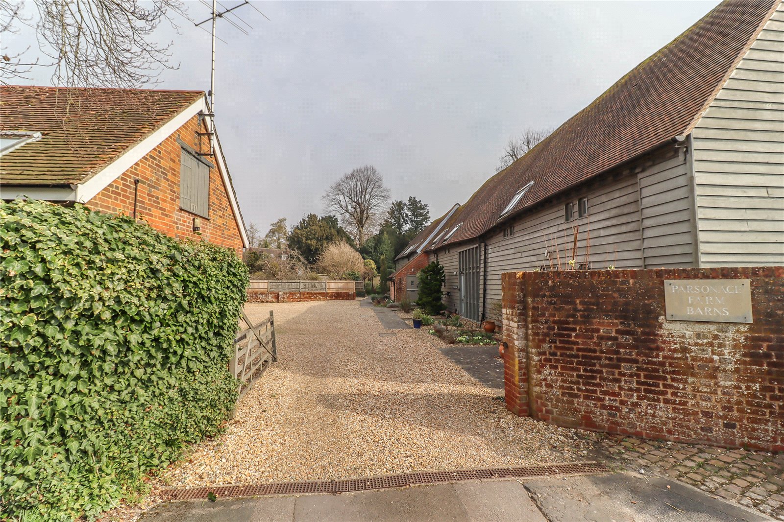 Outside Beside the war memorial in the centre of Kings Somborne a five bar gate gives access to a large gravelled courtyard area extending to the front of Parsonage Farm Barns providing access to the parking and carport. Paved path leads to the front access with well stocked shrub borders to either side. Curved retaining wall and space for ornament or pots above.