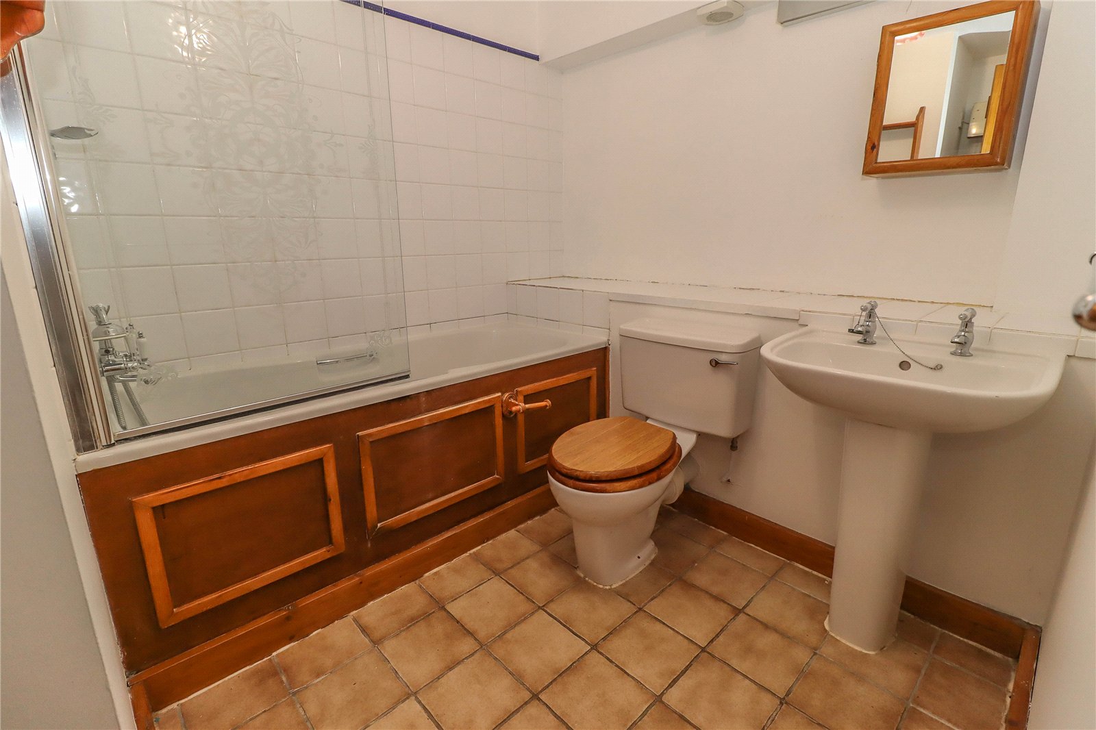 Family Bathroom White suite comprising pedestal wash hand basin, low level WC and panelled bath with mixer tap/handheld shower attachment with overhead wall mounting, glass shower screen and fully tiled surround, wide ceramic tiled sill, mirror fronted cabinet and striplight/shaver socket. Ceramic tiled flooring. Light and extractor fan.