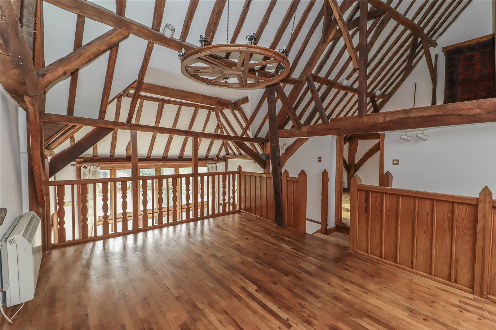 Living Room A substantial reception room featuring a stunning high vaulted ceiling, two magnificent exposed queen post trusses and roof framework, illuminated by spotlights and reclaimed wagon wheel multi-point ceiling light. Fireplace with cast in-set iron log burning stove, raised quarry tile hearth and rustic oak mantelpiece above. Long decorative balustrade/gallery overlooking the garden room below and full height glazing to the rear garden. Oak strip flooring.