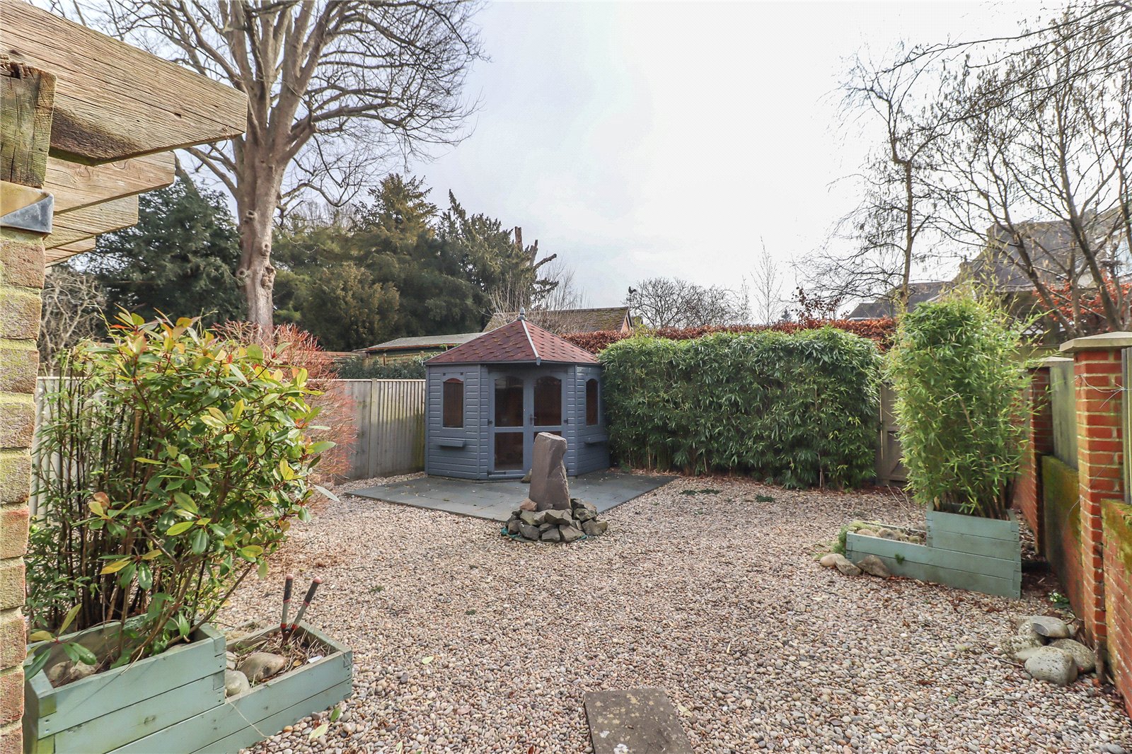 Rear Garden Wide paved terrace screened to either side by tall brick walls. High pergola with surrounding brick screen walls on lead capped piers. Raised shrub border. Timber shed and water butt. Timber framed summer house with paved seating area to front. A gate at one end of the terrace gives access to steps rising to an upper area laid to pebbles with central slate water feature. Acer and raised planters with Photinia and ornamental bamboo. Gate and path to road.