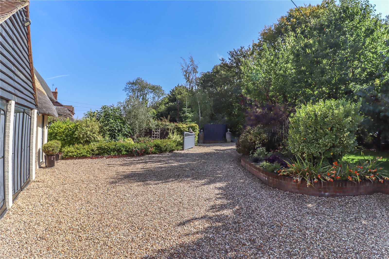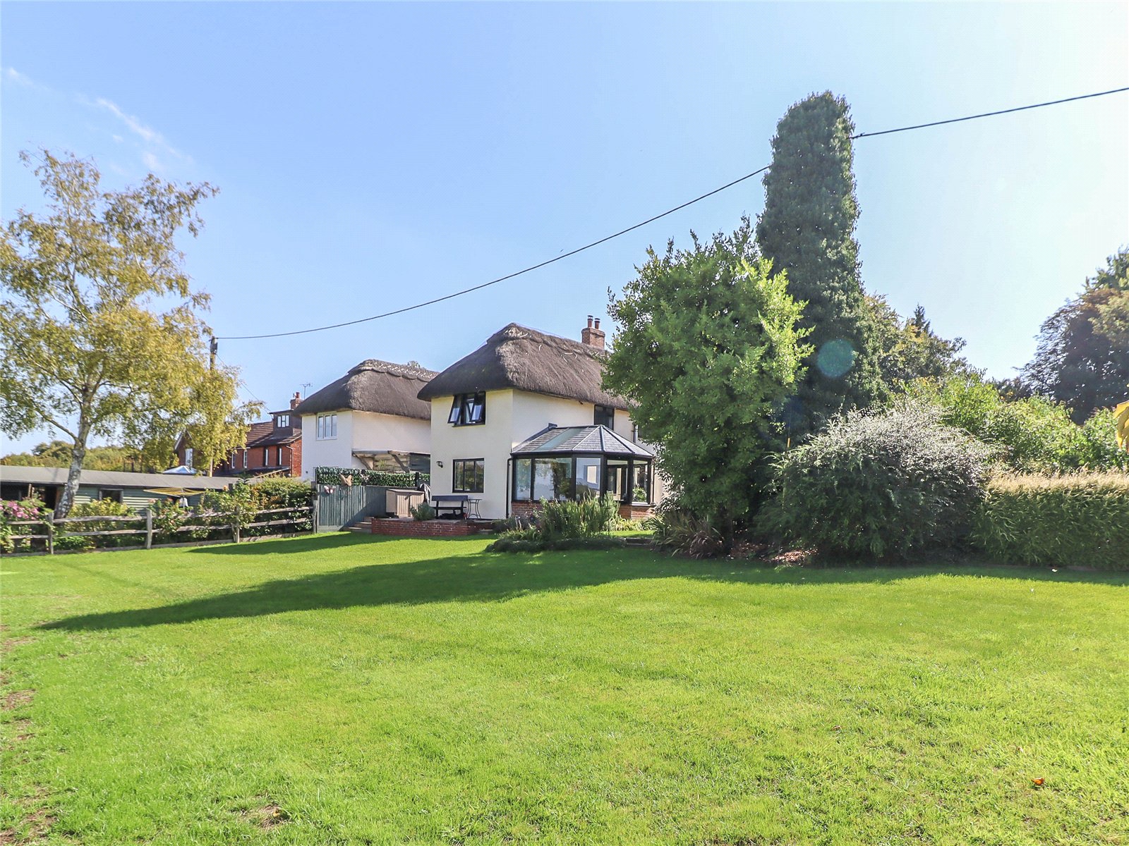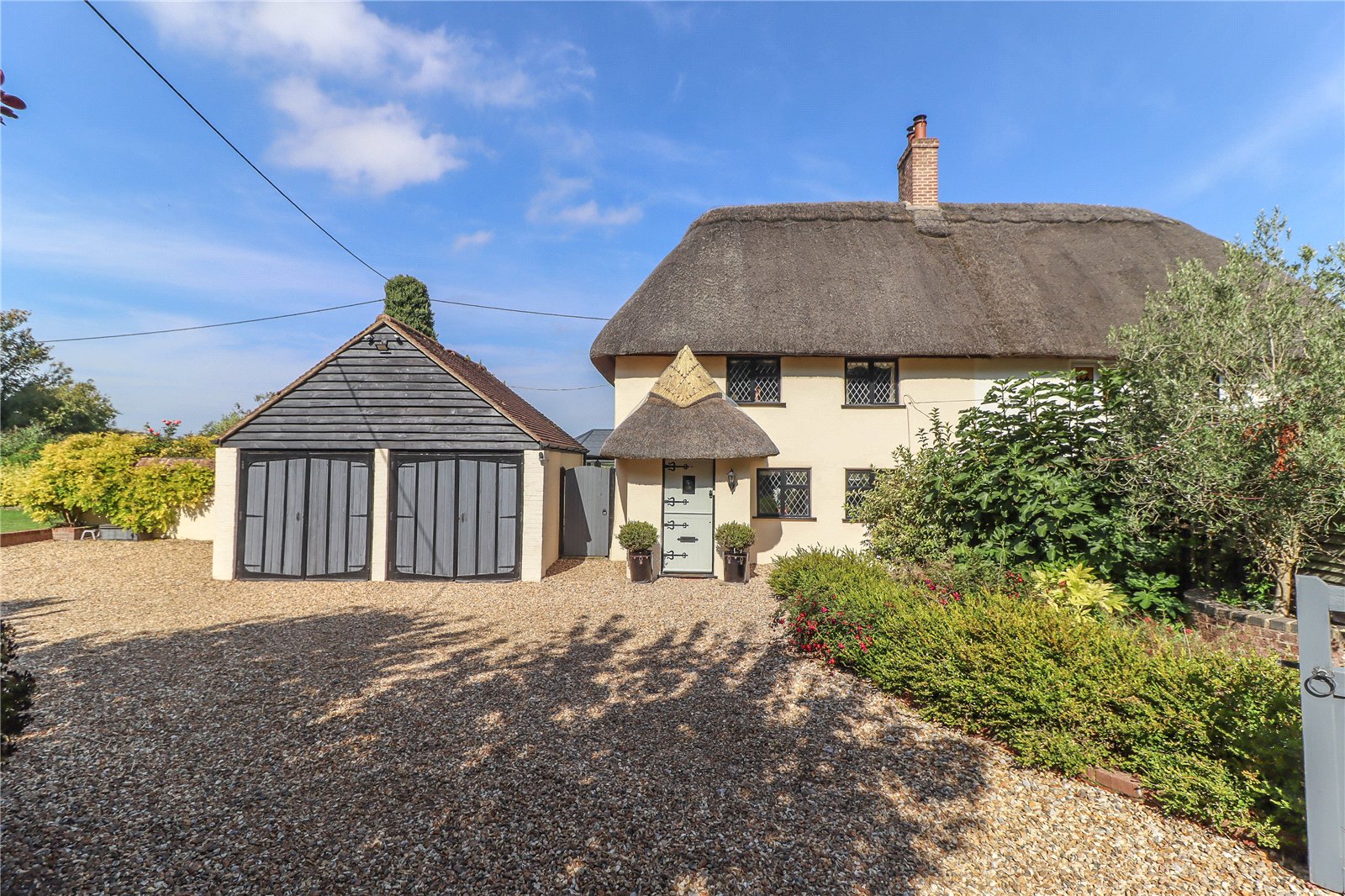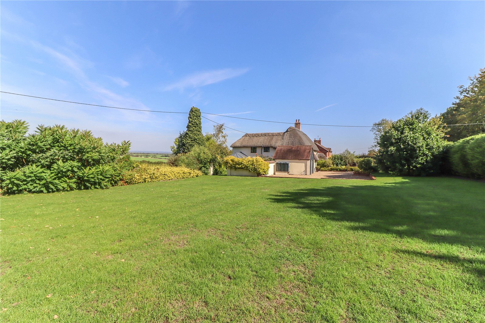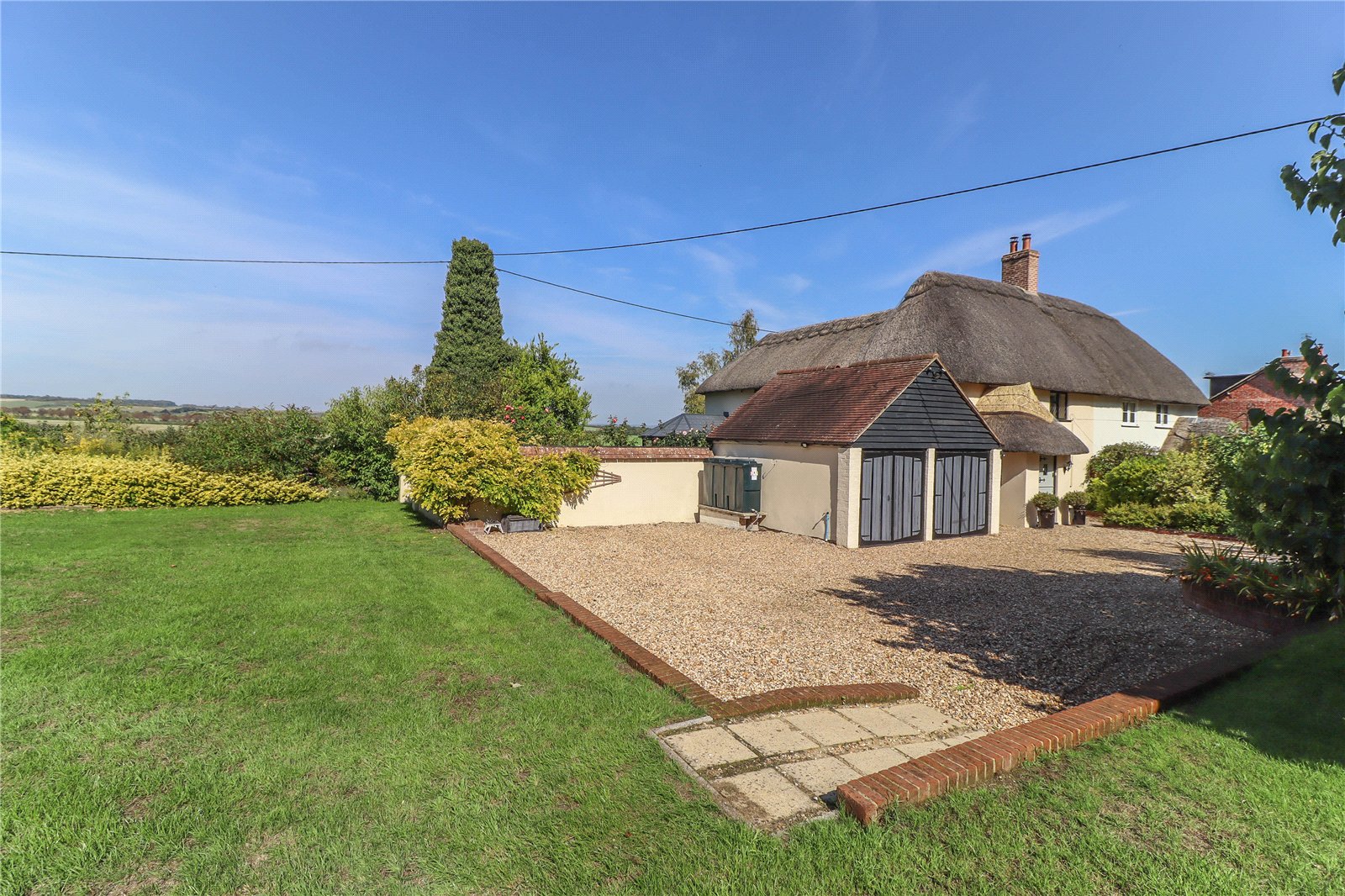 An extended semi-detached family home, only partially linked to the neighbouring property. This un-listed period house benefits from double glazing and oil central heating. Constructed of smooth rendered elevations beneath a thatched roof. Standing in a large half-acre plot with an extensive garden the property enjoys superb far-reaching views across farmland and countryside to the north. The accommodation is well presented and includes: porch, inner hall, sitting room with inglenook fireplace incorporating a log-burner, open-plan kitchen/dining room, garden room, study, utility and cloakroom. The first floor offers four bedrooms, one en suite, also a family bathroom. Outside the property benefits from an extensive gated driveway with ample parking and double garage.