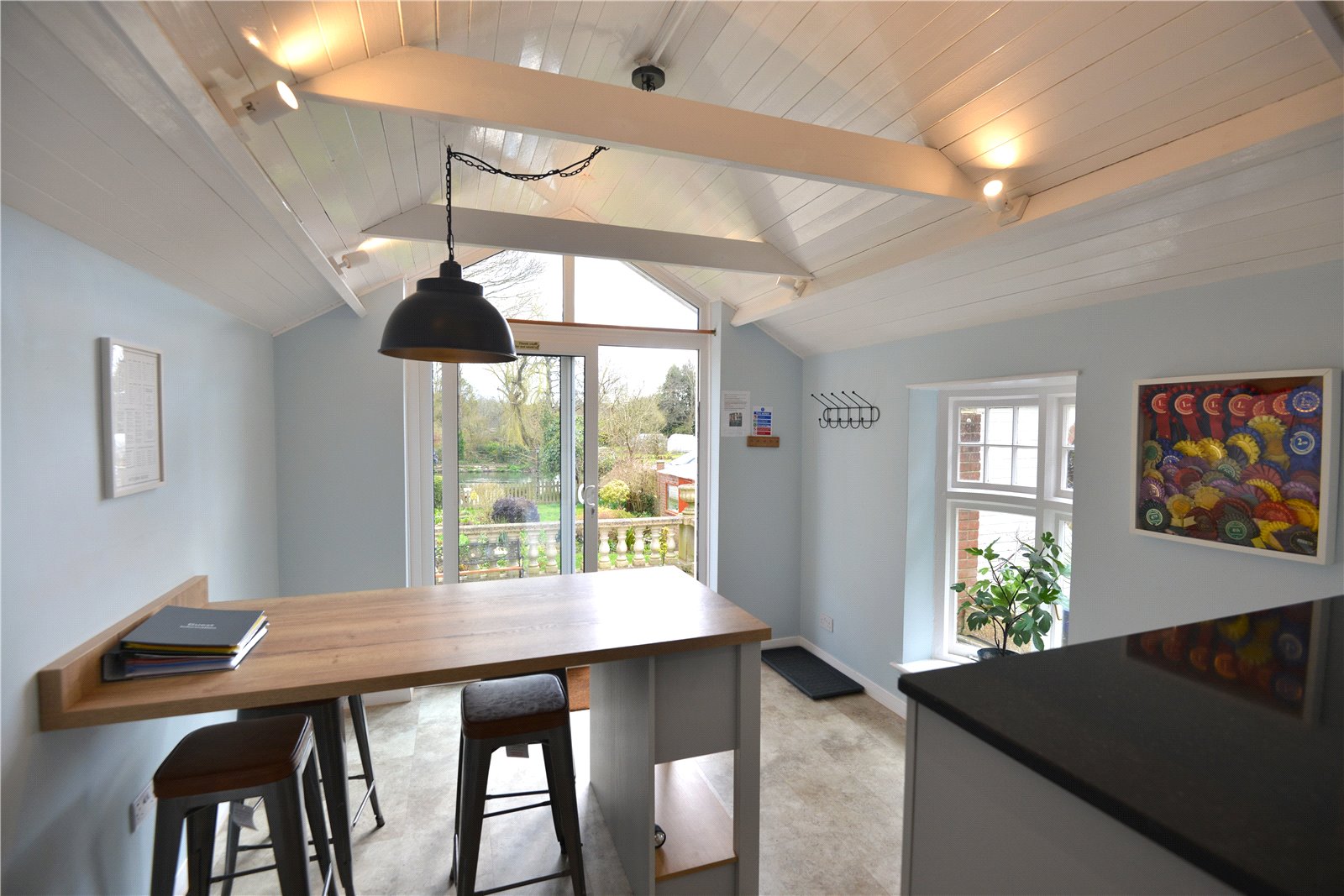 Kitchen/Breakfast Room Fitted with a modern range of light grey fronted base units incorporating cupboards and drawers beneath a quartz work surface. Wall cupboards. Larder cupboard with wall mounted boiler. Enamel sink. inset 4 plate induction hob with hood over. Built-in electric double oven. Integrated fridge/freezer. integrated dishwasher and washing machine. Pull out bin store. Radiator. Window to the side. Steps down into breakfast area. Vaulted ceiling. Radiator. Window to side. Sliding doors onto the patio and garden with river views.