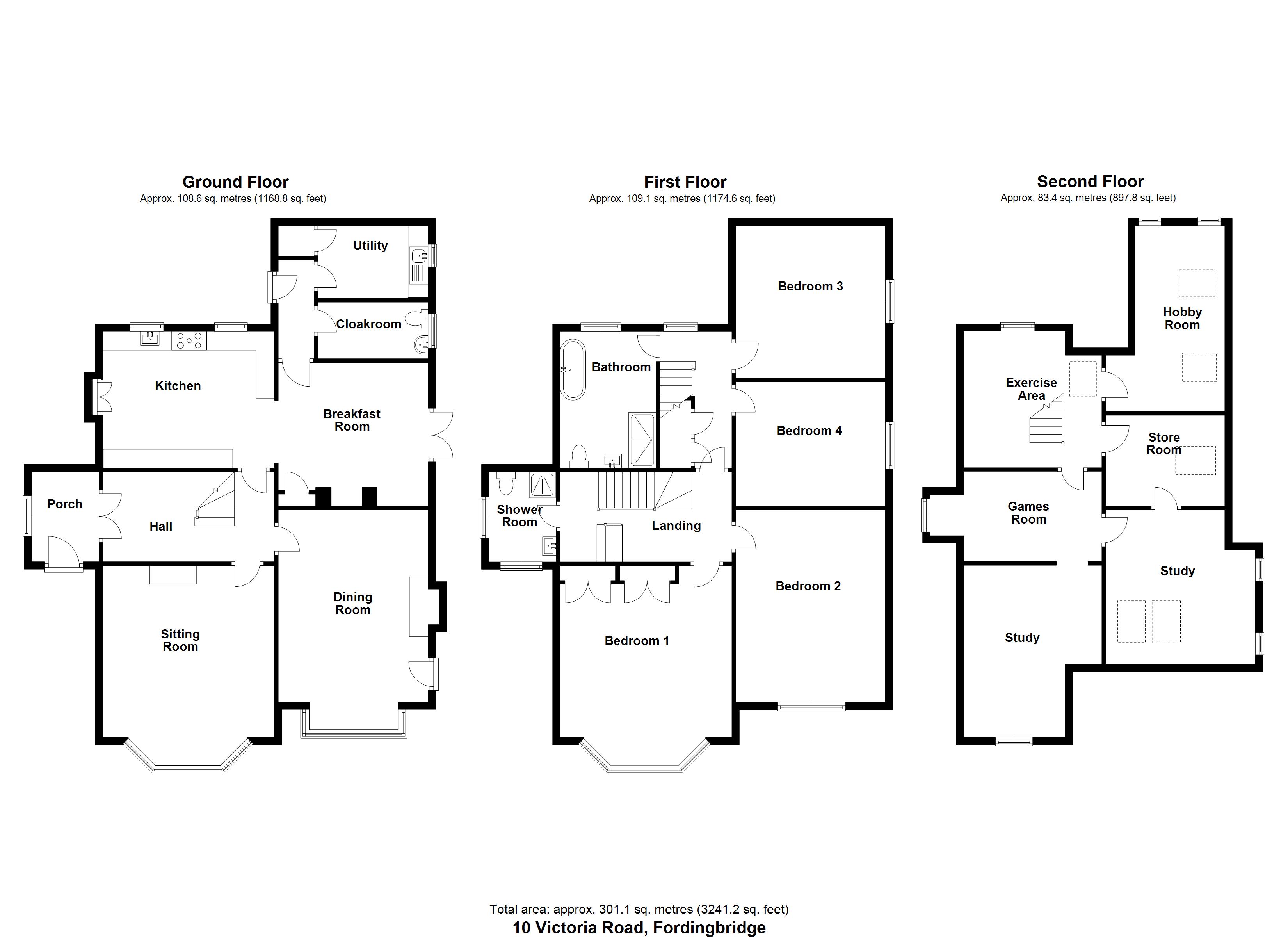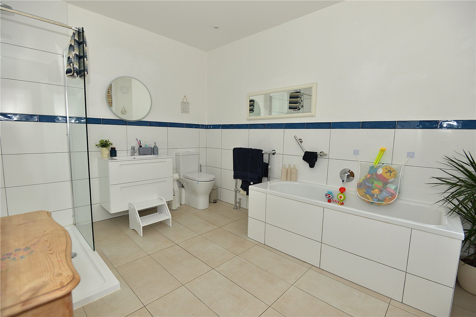 Family Bathroom 3.66m (12 ft 0in) x 2.74m (9ft 3in). Large tiled shower cubicle. Panelled bath. Wash hand basin with cupboards under. Low level WC. Heated towel rail.