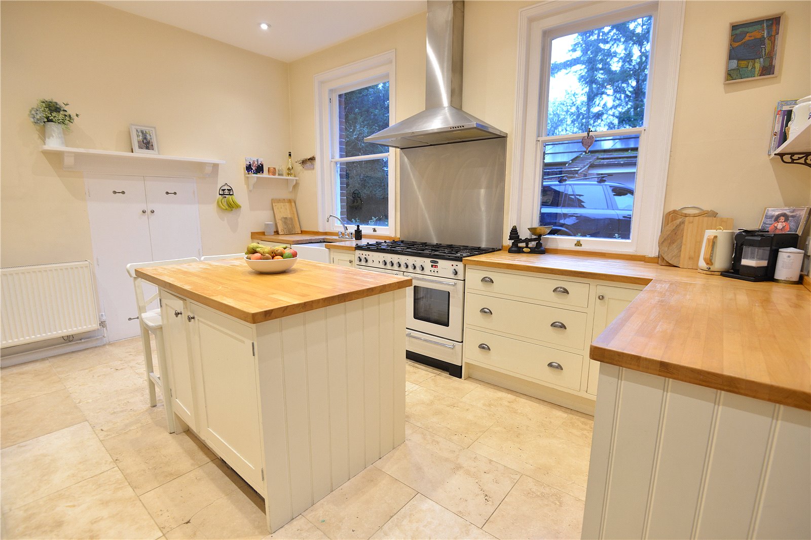 Kitchen 4.57m (15 ft 0in) x 3.66m (12ft 0in). Fitted with a range of painted wooden units comprising cupboards and drawers, hand built by Dorset Kitchens. Twin upright storage cupboards. Beech work surface surrounding Butler's sink with mixer tap and drainer. Breakfast island with matching work surface and cupboards including bin unit under. Recess for range style gas fired oven with stainless steel extractor fan. Integrated dishwasher. Space for fridge/freezer. Tiled floor. Open to:
