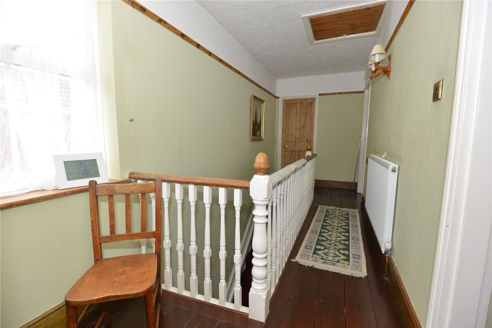 Landing Roof access. Exposed wooden floorboards. Picture rail.