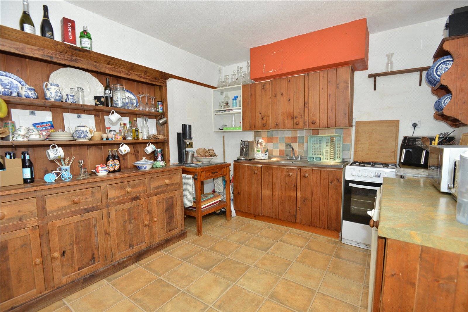 Kitchen Wooden units at base and eye level. Work surface over. Single bowl sink with double drainer. Space for gas cooker. Space and plumbing for diashwasher. External stable style door to rear garden.