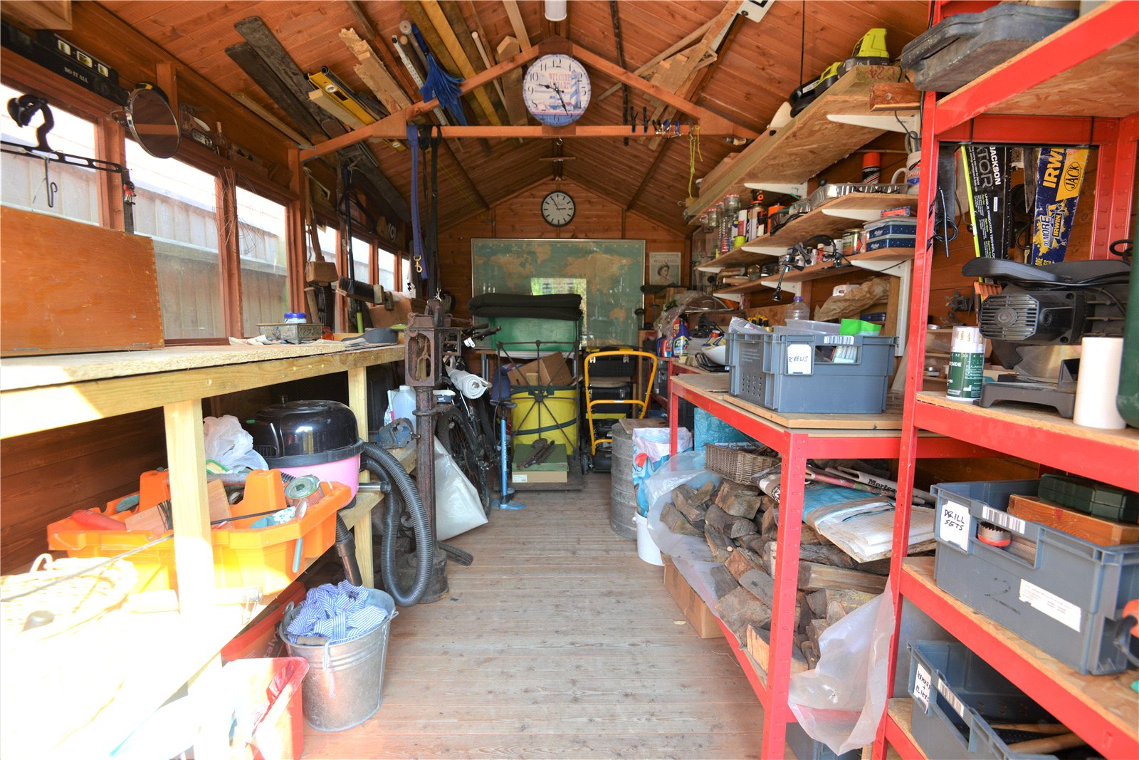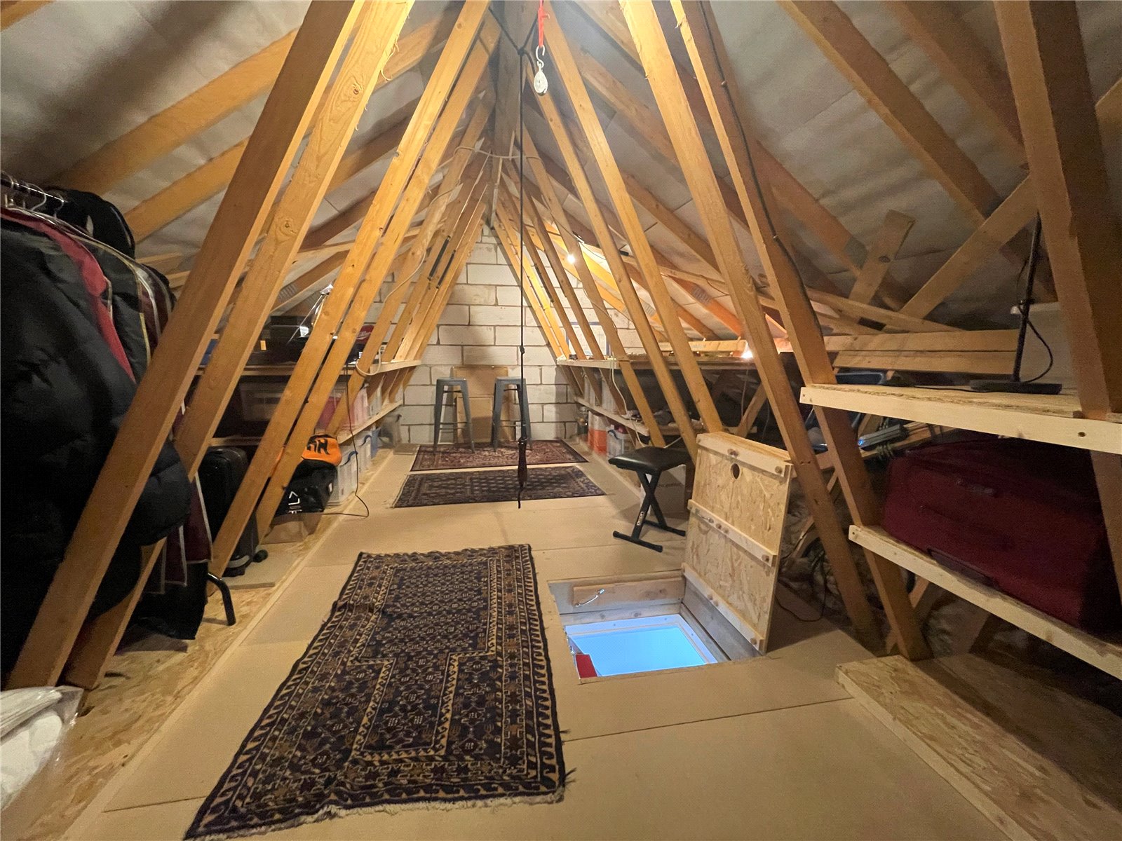 Landing Roof hatch with ladder to boarded loft with racking and storage - suitable for hobbies space. Airing cupboard.