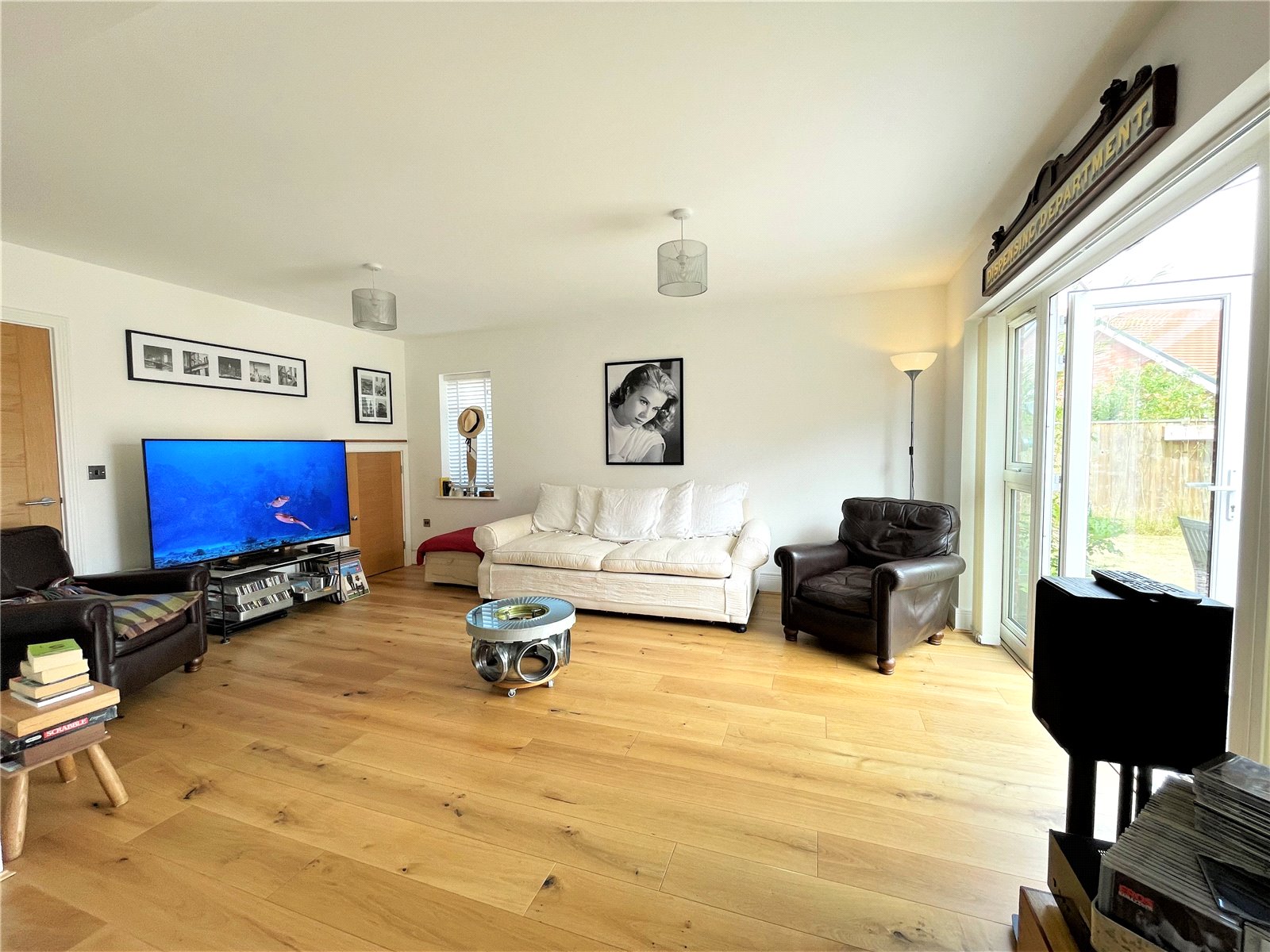 Sitting Room Light open-plan room with double doors to garden. Oak flooring. Understairs storage cupboard. Open to: