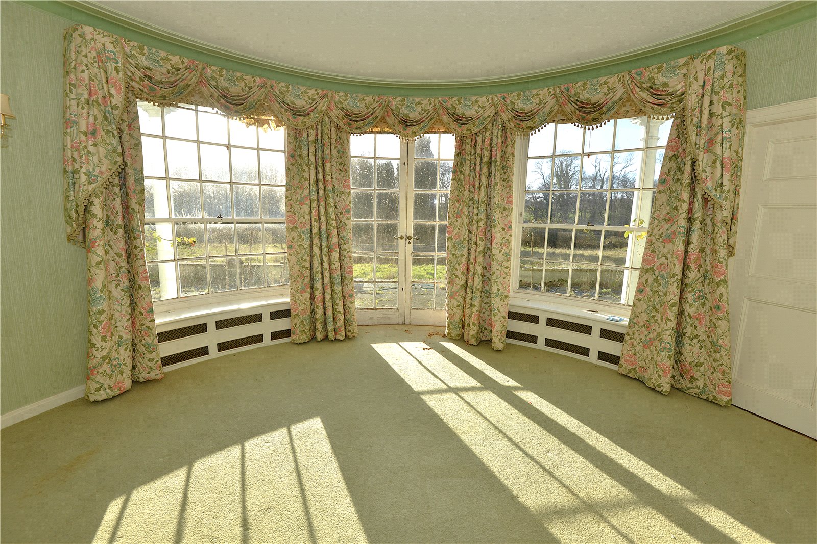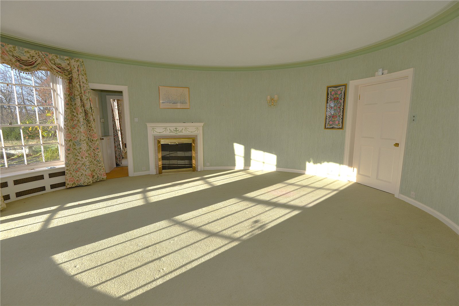 Drawing Room Gracious oval room with curved windows and curved French doors leading out onto the terrace. Open fire with grate, firedogs and a brass and glass fire screen. Carved wooden mantel over.