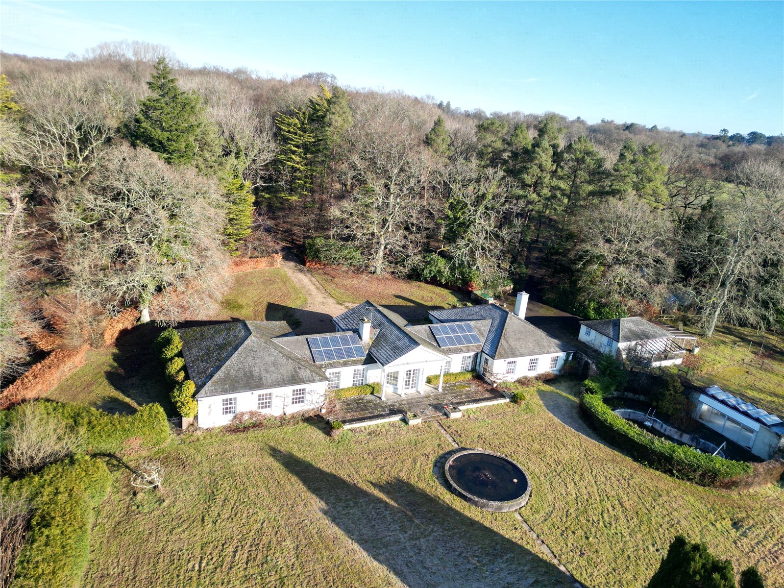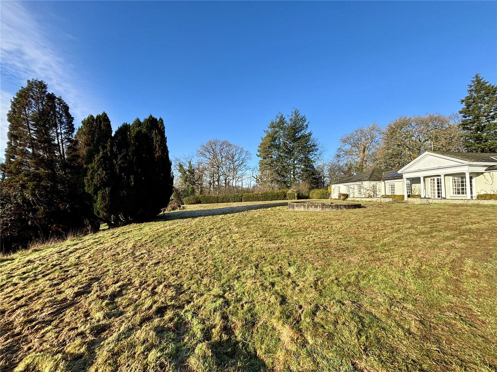 The impressive grounds comprise a mixture of lightly populated copse of predominantly oak woodland to the north of the house and lawn with large raised pond and water meadow to the south. Immediately adjacent to the rear of the house is a large flag stone terrace with steps down to the lawn. The water meadow leads to the River Allen, for which the house enjoys fishing rights. There is a former swimming pool with pool house/changing room and entertaining space and a former hard-surface tennis court to the east of the house, all of which are in need comprehensive maintenance/replacement. There is also a tractor shed, large chicken coop, greenhouses, and water well.