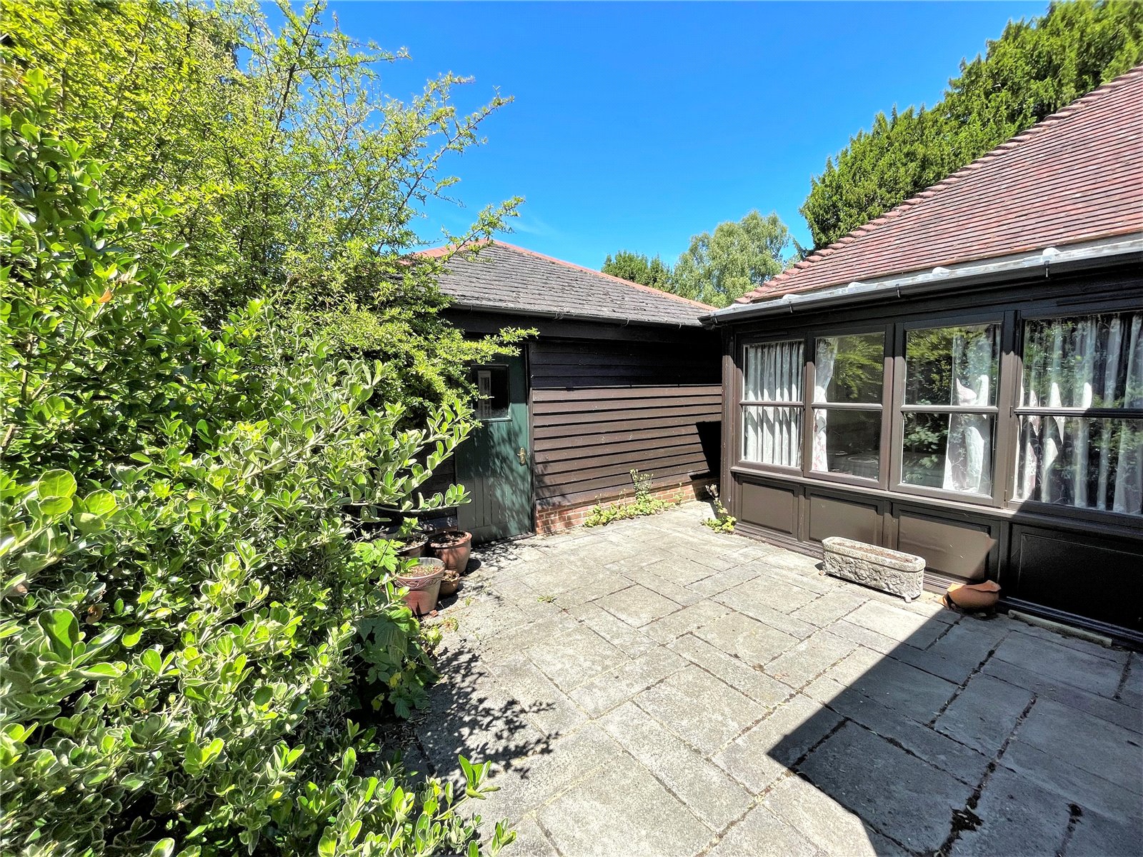 To the rear of the property is an enclosed courtyard style garden with an attractive, well-stocked shrub border, which can be accessed from the conservatory. The garden benefits from a southerly orientation and direct access via a personal door into a SINGLE GARAGE: 5.56m (18ft 3in) x 3.05m (10ft 0in) with power and light connected and overhead storage.