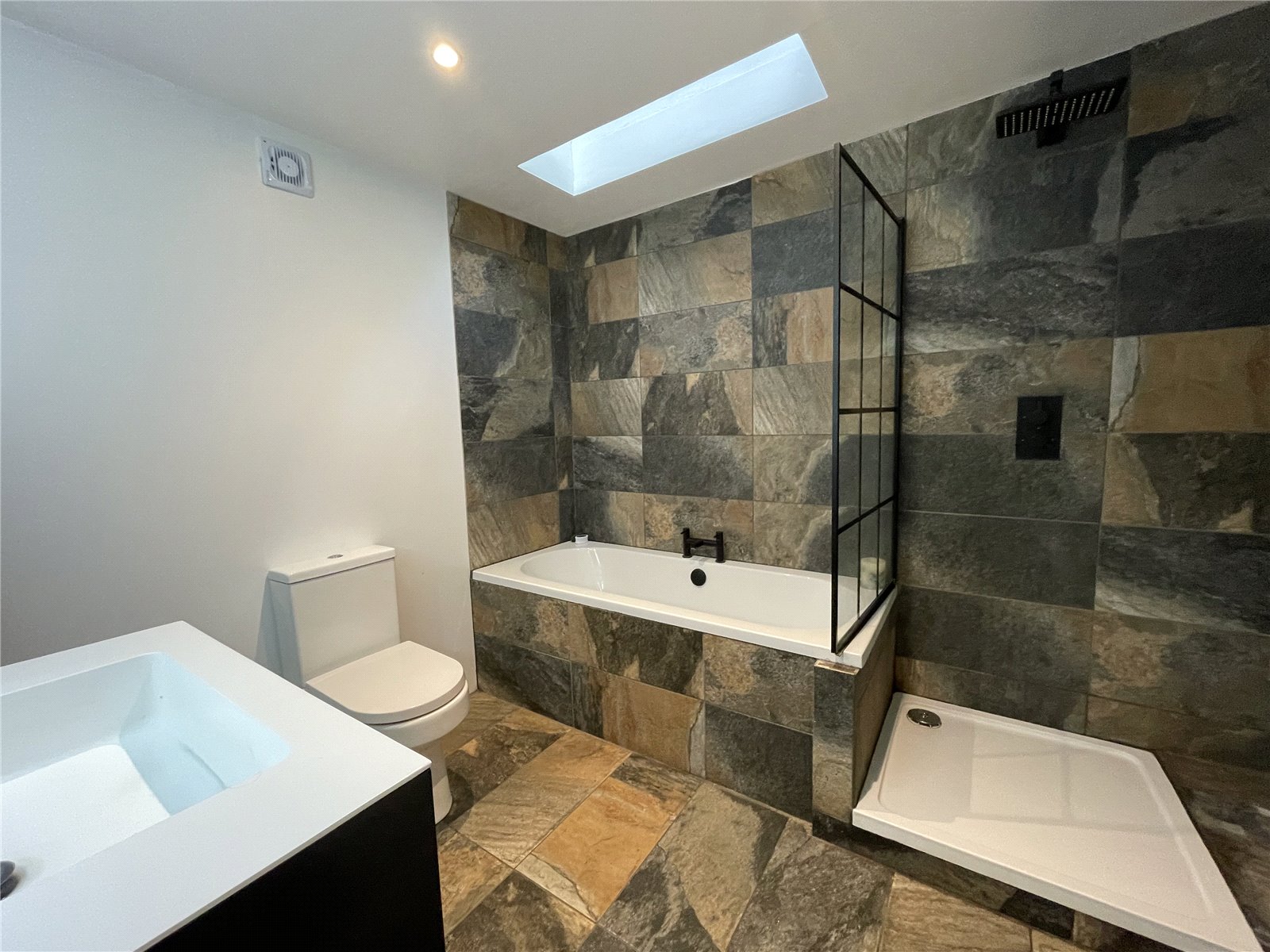 Ensuite Bathroom    Tiled bath. Shower cubicle. Vanity unit. Wash hand basin with drawer under. W/C. Heated towel rail. Tiled floor.
