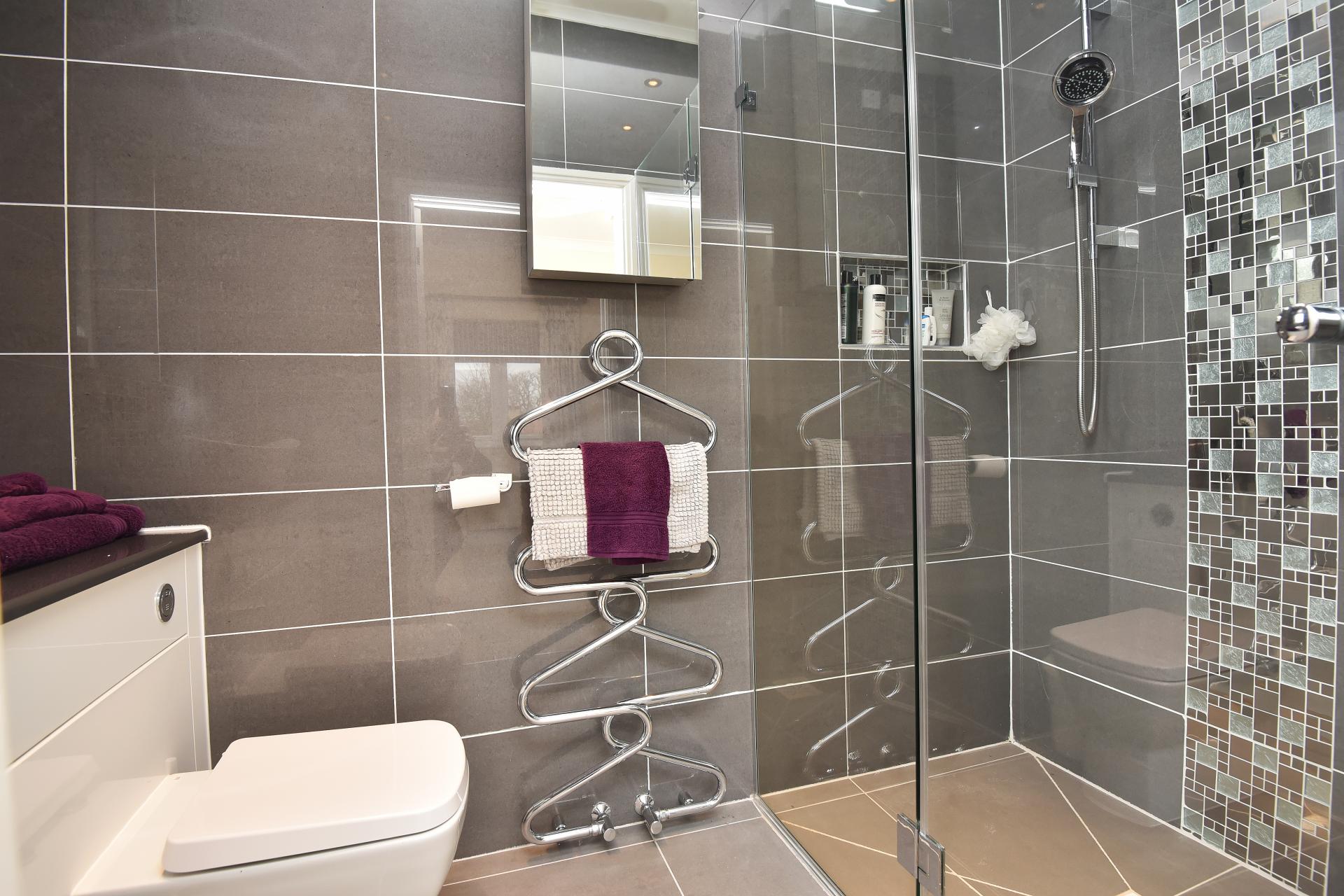 Modern charcoal suite comprising low-flush WC, washbasin with storage below, and walk-in shower cubicle. Tiling to walls and floor with heated towel rail.