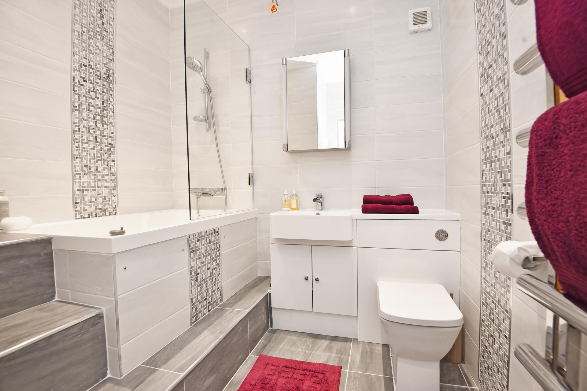 A Modern white suite comprising low-flush WC, washbasin with storage below, luxury spa bath with power shower and glass screen. Tiling to walls and tiled floor, heated towel rail.
