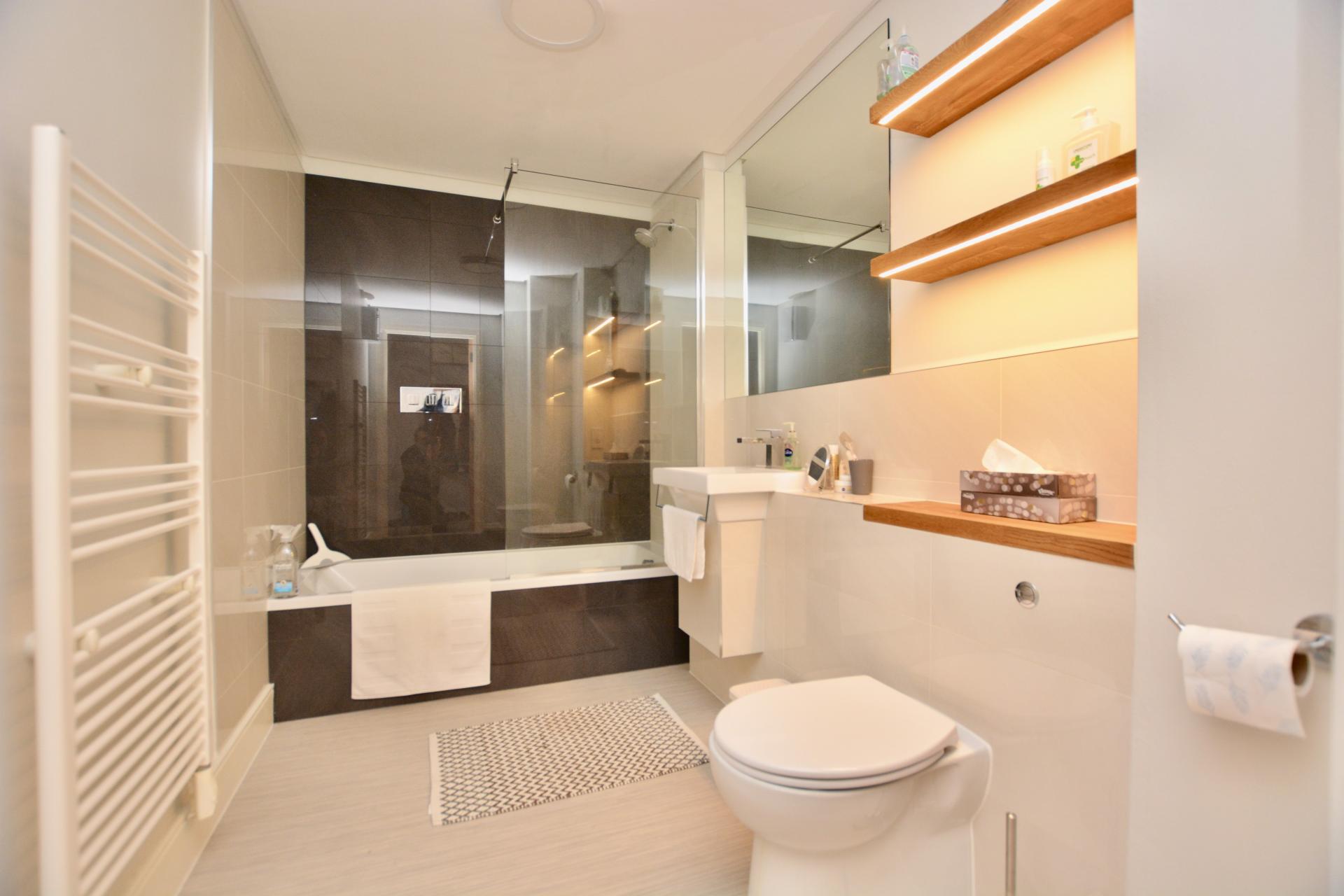 No. 5 is one of the larger one bedroom units (48.1 sqm / 518 sq ft) and is also an end flat — so external walls to two sides. In recent years a full programme of refurbishment works were undertaken to include a luxury bathroom with smart fittings and concealed lighting, a brand new fully integrated kitchen (oven, hob, extractor, duel washer/dryer, dishwasher and fridge / freezer) fresh decor, new carpets and newly installed double glazed windows to the bedroom and living room.