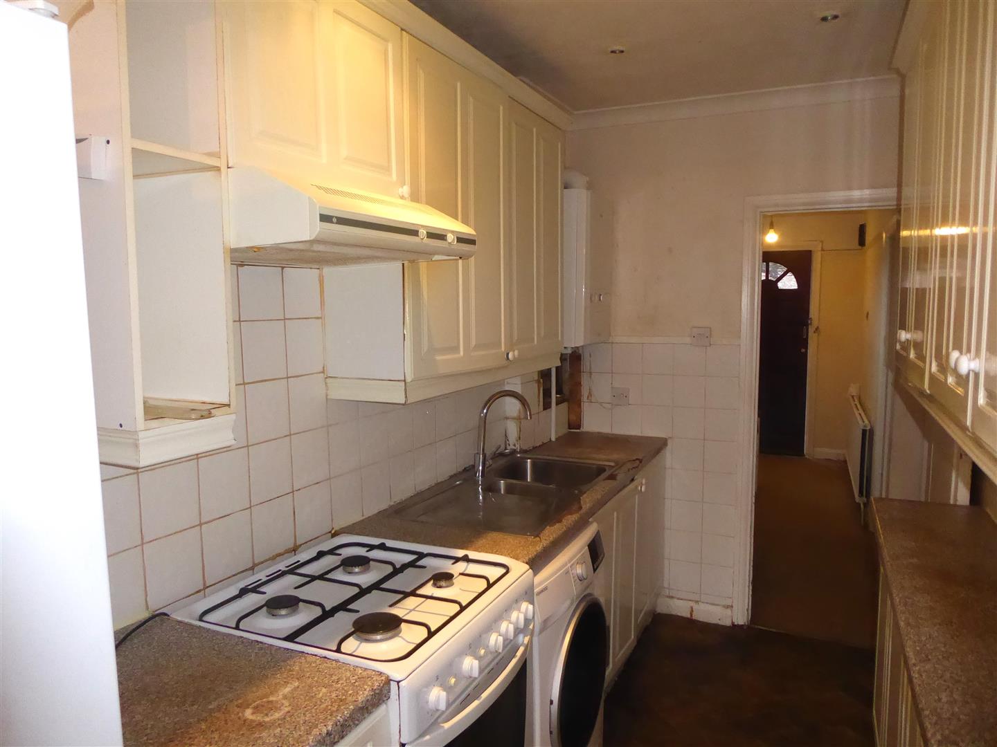 Kitchen - Range of wall and base units, 1 1/2 bowl sink with mixer tap, space for gas cooker, washing machine, wall mounted combination boiler, part tiled walls, vinyl flooring.