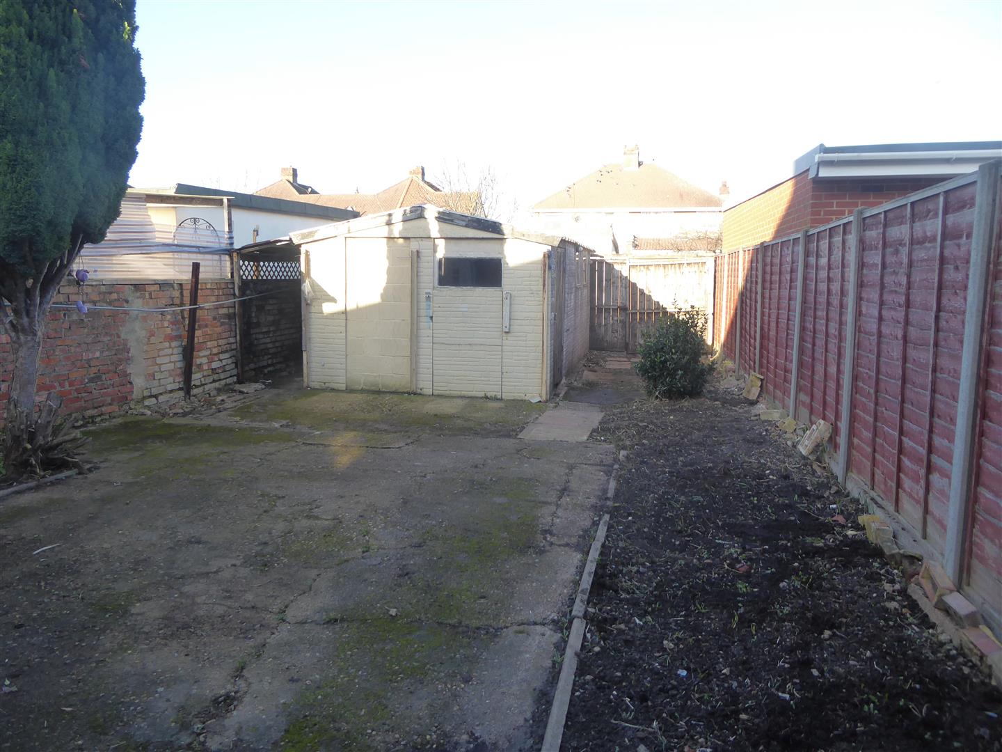 Rear Garden - Concrete area with flower bed, gate to rear service road.