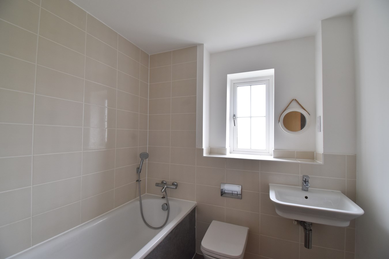 Double glazed obscured window to front. Suite of concealed low level WC, wall mounted hand basin and panelled bath with shower attachment. Localised tiling. Chrome towel rail.