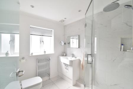 Double glazed frosted window to front. Suite comprising of low level WC, wash hand basin and corner shower cubicle with glass screen. Tiled walls. Chrome heated towel rail. Underfloor electric heating.