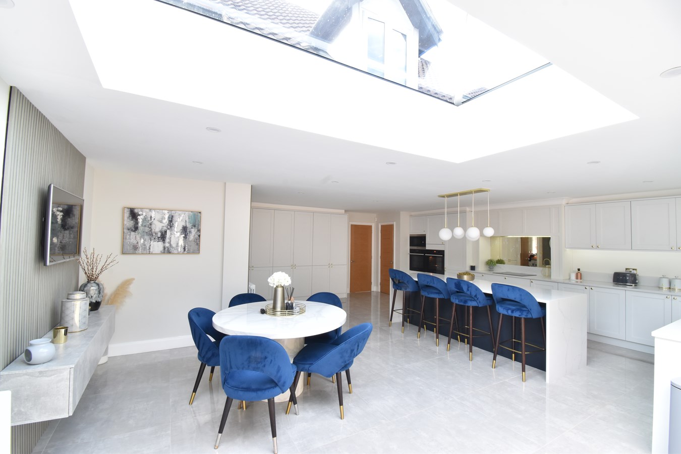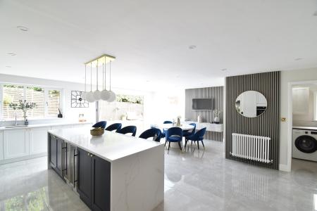 23' 11" x 23' 9" (7.29m x 7.24m) Double glazed window to rear and side. Sky lantern. Double glazed bi-fold doors to rear. Range of base and wall units with Quartz worktops. Induction hob with extractor. Sink with boiling tap. Integrated dishwasher. Integrated microwave and two separate electric ovens. Kitchen island and breakfast bar with base units and wine chiller. Feature wall with TV point. Two radiator.