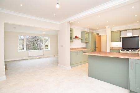 A modern kitchen with a range of fitted units, gas cooker, and integrated appliances. Window and glazed door leading to the rear garden. A further reception room with window to the rear, ample space for dining.