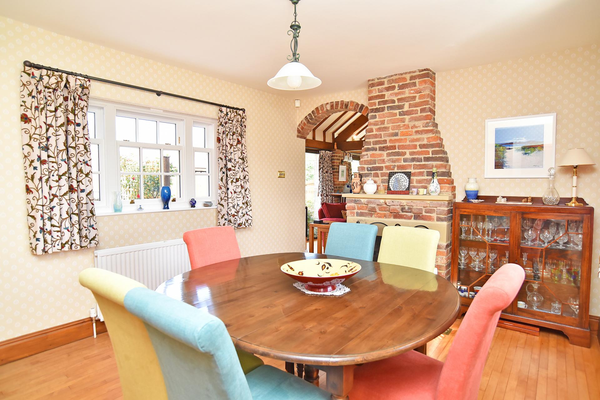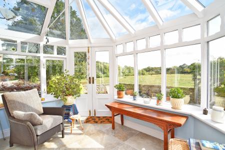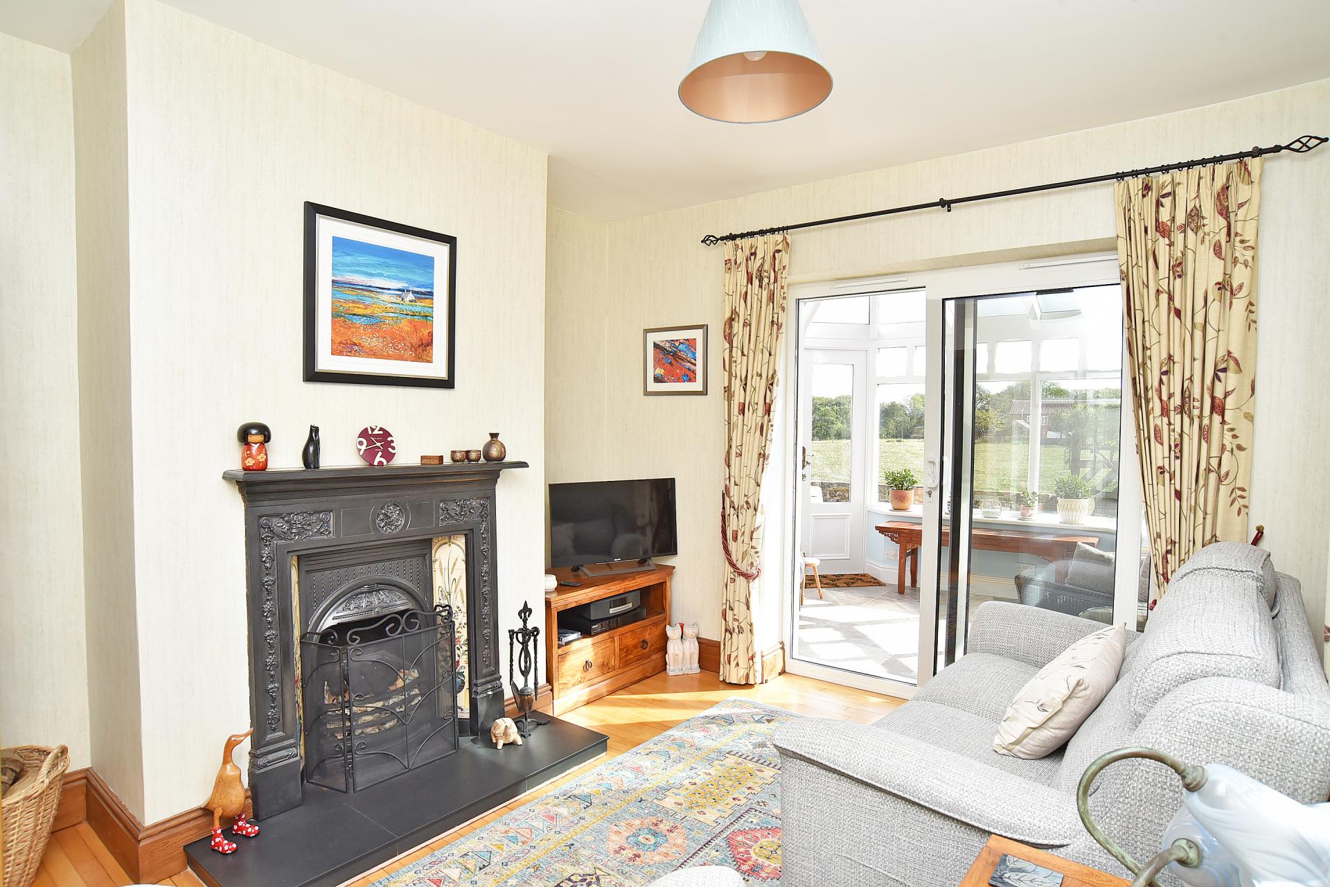 A further reception room with adjoining conservatory, providing flexible family living and views over the garden and fields beyond. Attractive fireplace with open fire.