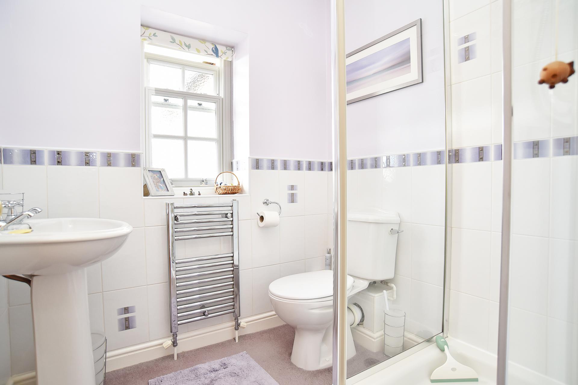 A white suite comprising WC, washbasin and shower. Heated towel rail.