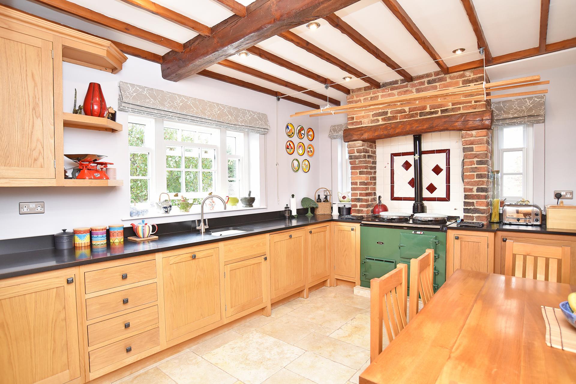 Fitted with a range of quality wall and base units, with gas fired AGA, integrated fridge and dishwasher. Space for dining table. Tiled flooring.
