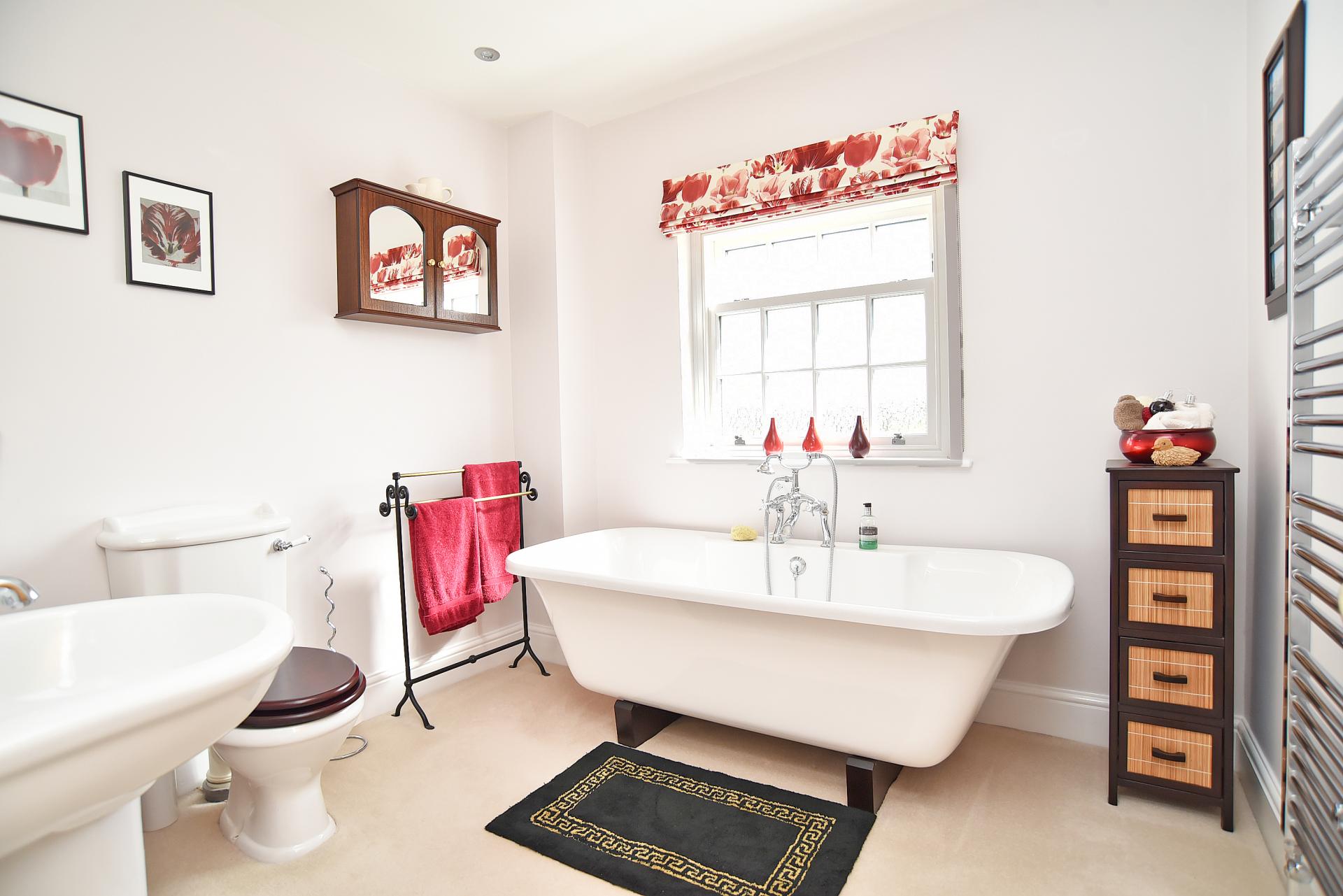 With free-standing bath, WC and washbasin. Heated towel rail.