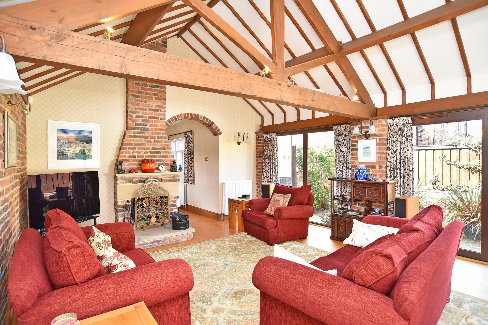 A large reception room with vaulted ceiling and exposed wooden beams. Feature fireplace with open fire. Windows and glazed doors overlook the garden.