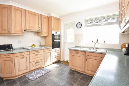 With a range of fitted units, gas hob, double oven, fridge and dishwasher. Door to side.