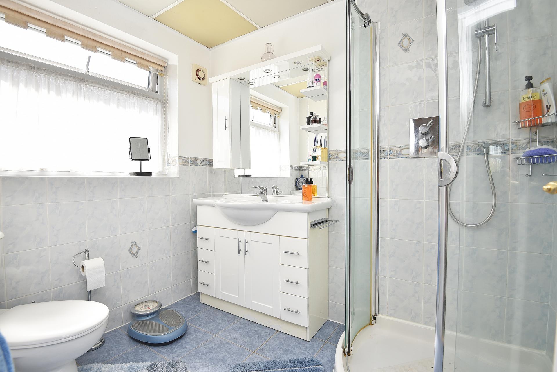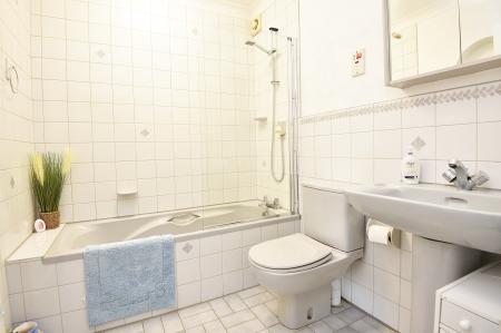 With WC, basin set within a vanity unit and shower. Heated towel rail.
