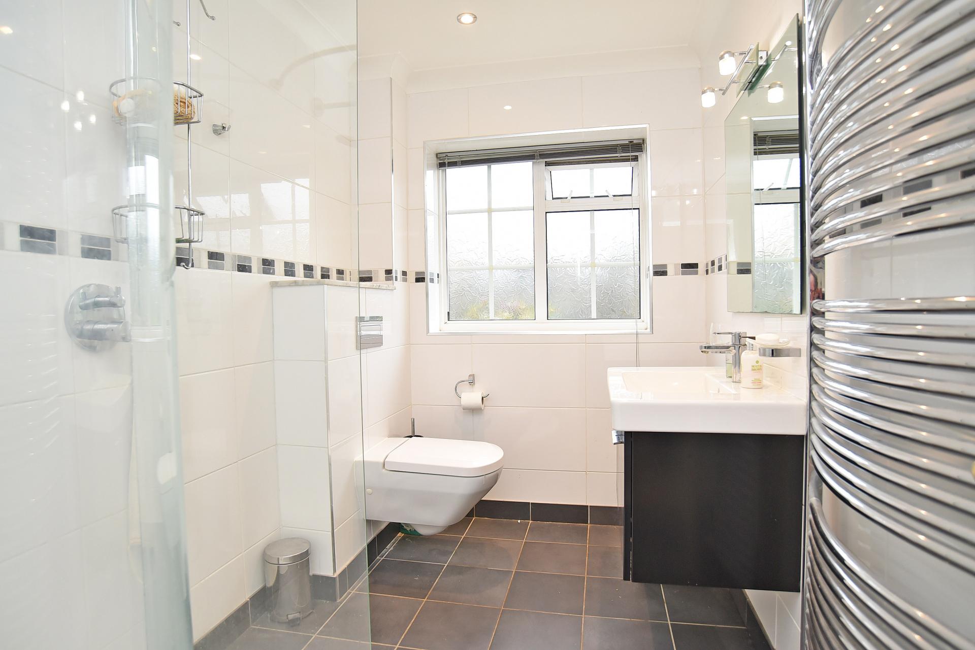 A white suite comprising WC, basin set within a vanity unit and shower. Heated towel rail.