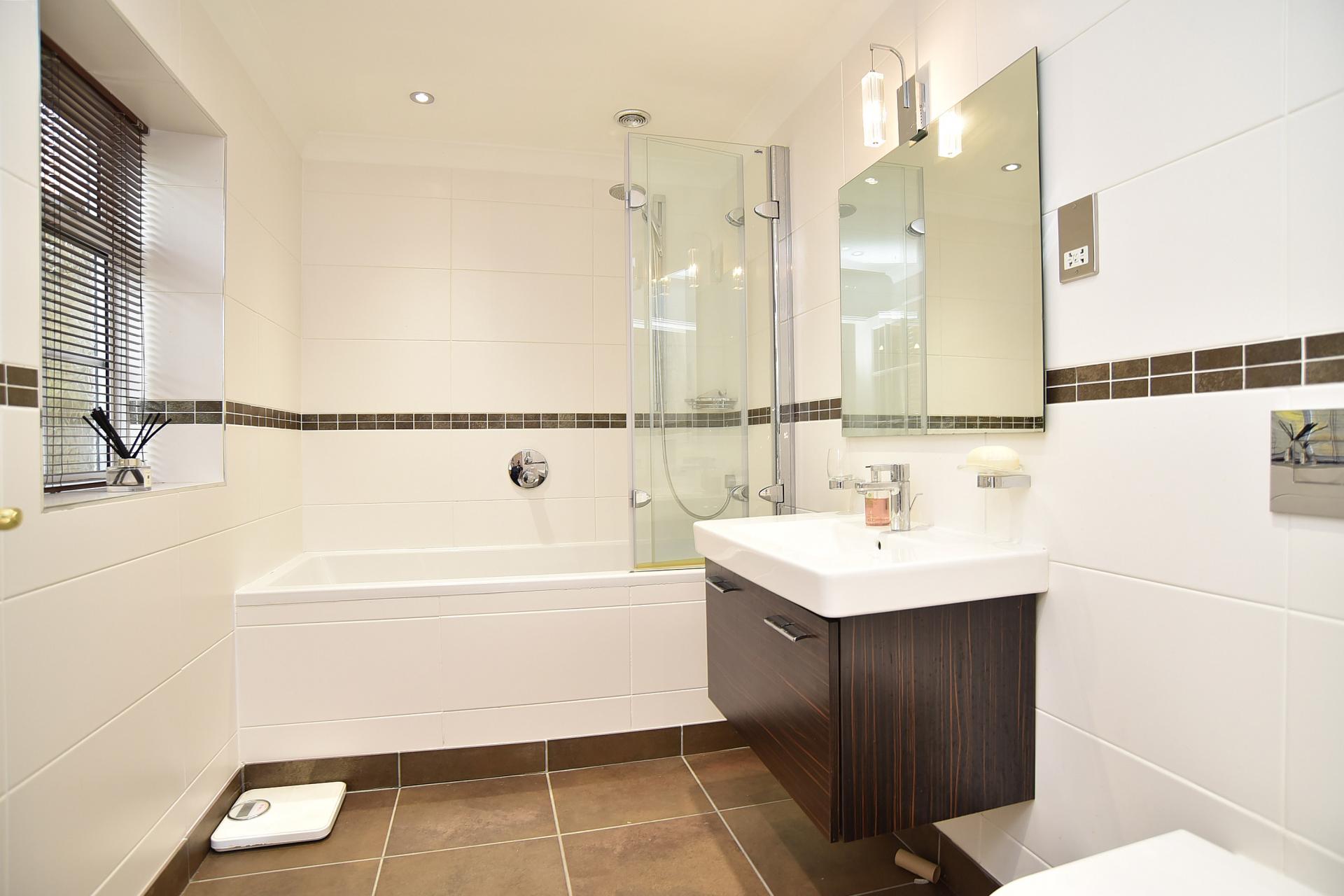 A modern white suite comprising WC, basin set within a vanity unit and bath with shower above. Heated towel rail.