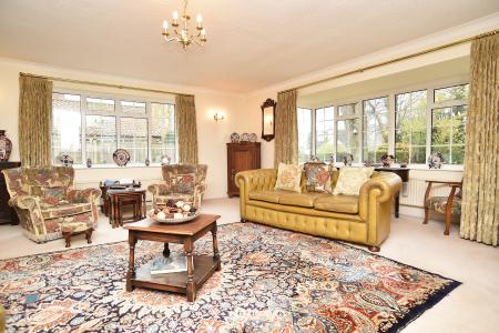 A generous open-plan reception space with sitting and dining areas and windows to the front and side, creating a light and inviting living area suitable for both relaxation and entertaining. Attractive fireplace with living flame gas fire.