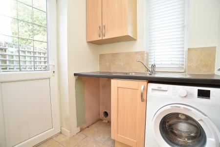 Wall and base unit with worksurface and sink. Plumbing in space for washing machine and tumble dryer. Window to front elevation and inside access door.