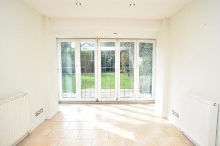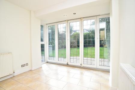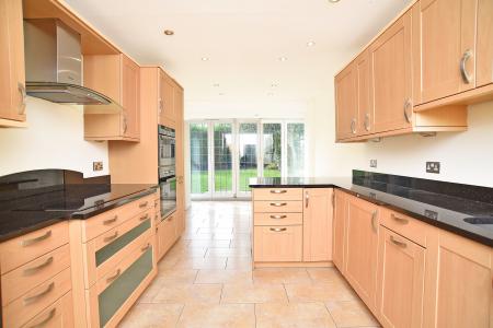 Modern fitted kitchen comprising wall and base units complimented with granite worktops with inset stainless stain bowl sinks, range of integrated appliances, including induction hob, extractor canopy over, dual microwave and oven and space for an American-style fridge / freezer. The dining area has room for family dining table and bi-fold doors out to paved area, ideal for alfresco dining.