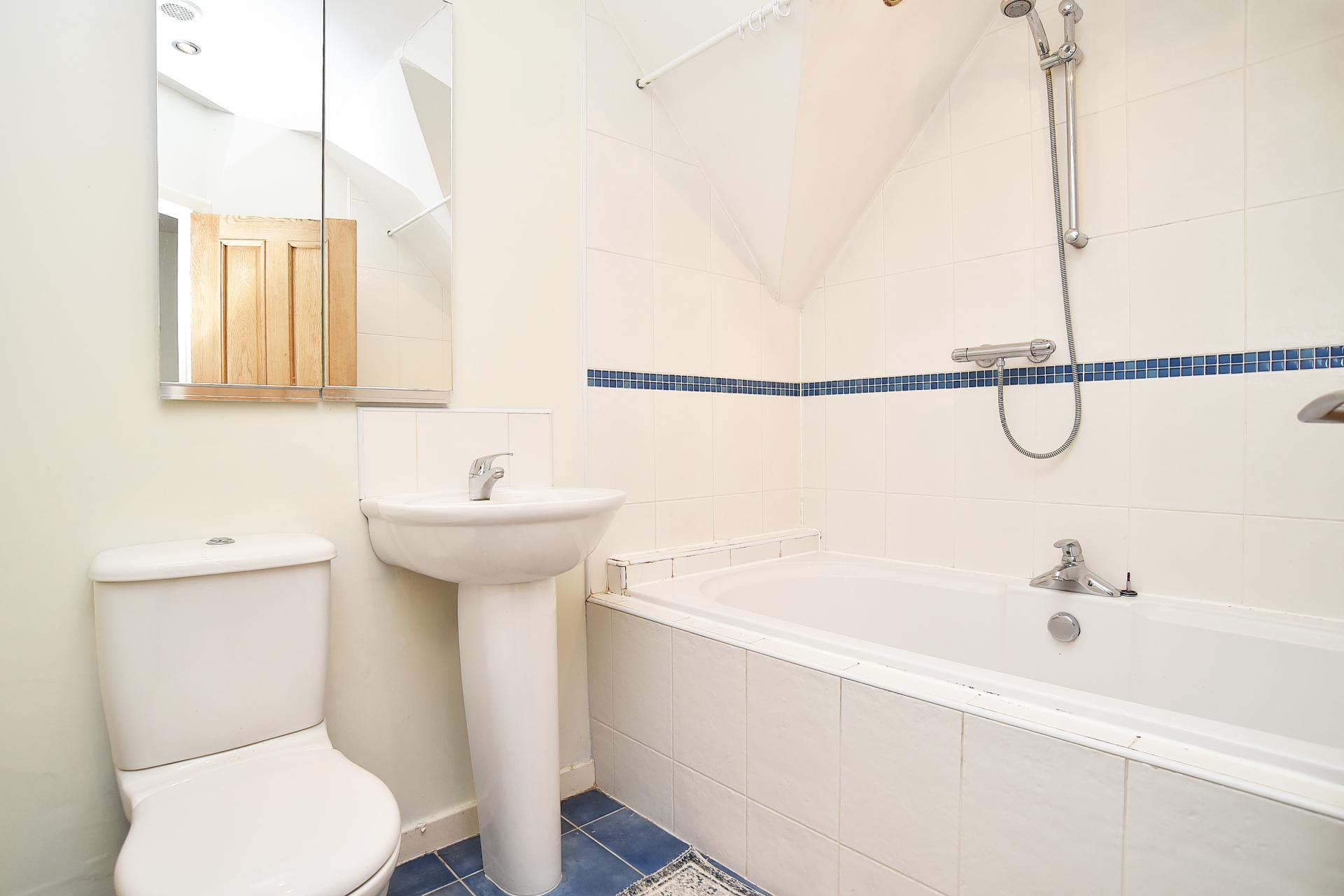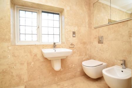 Low-flush WC, wall-mounted washbasin, chrome ladder towel rail, window to front elevation.